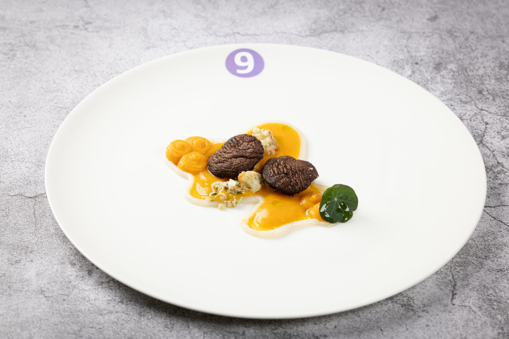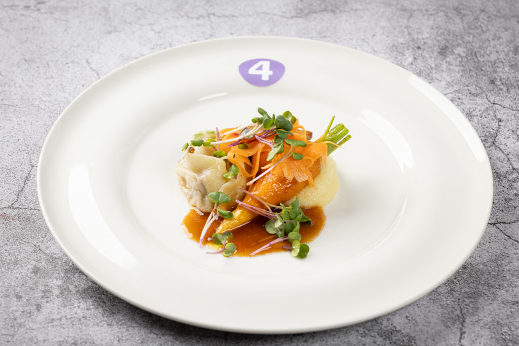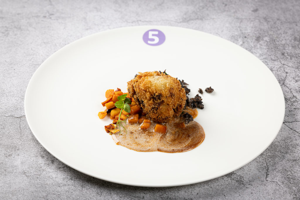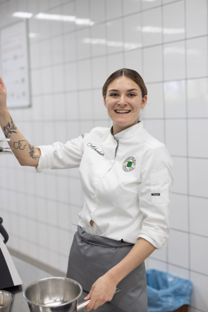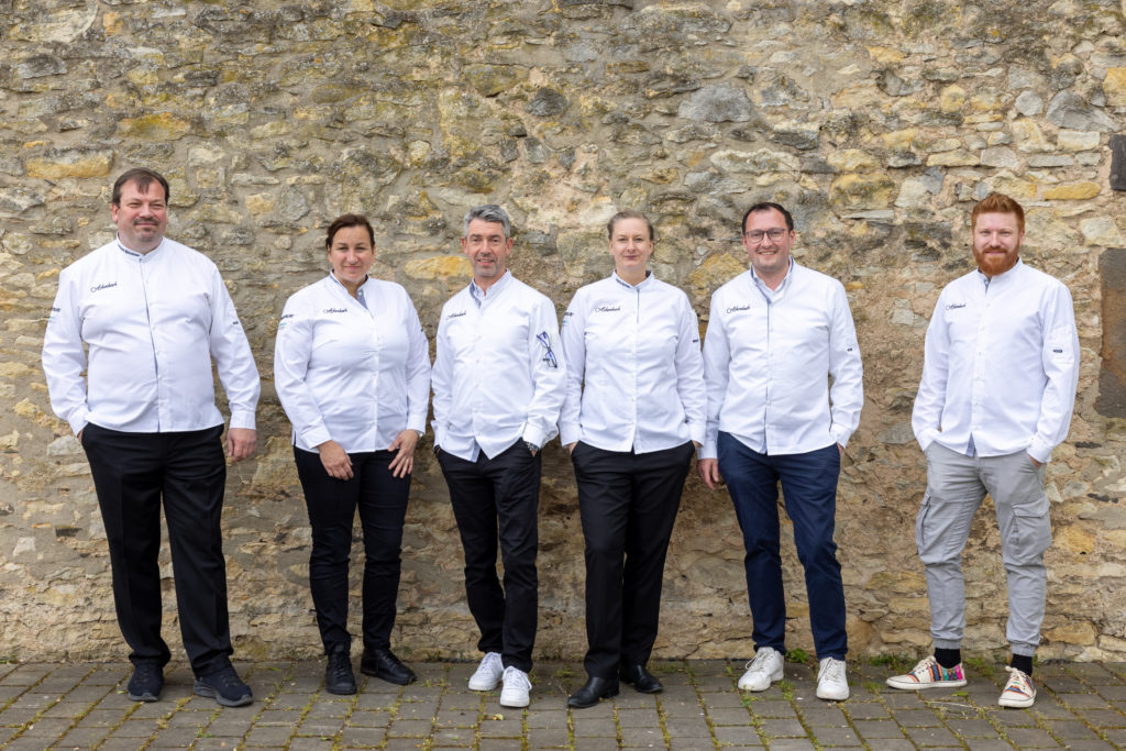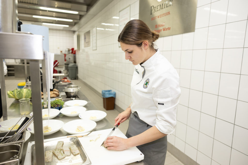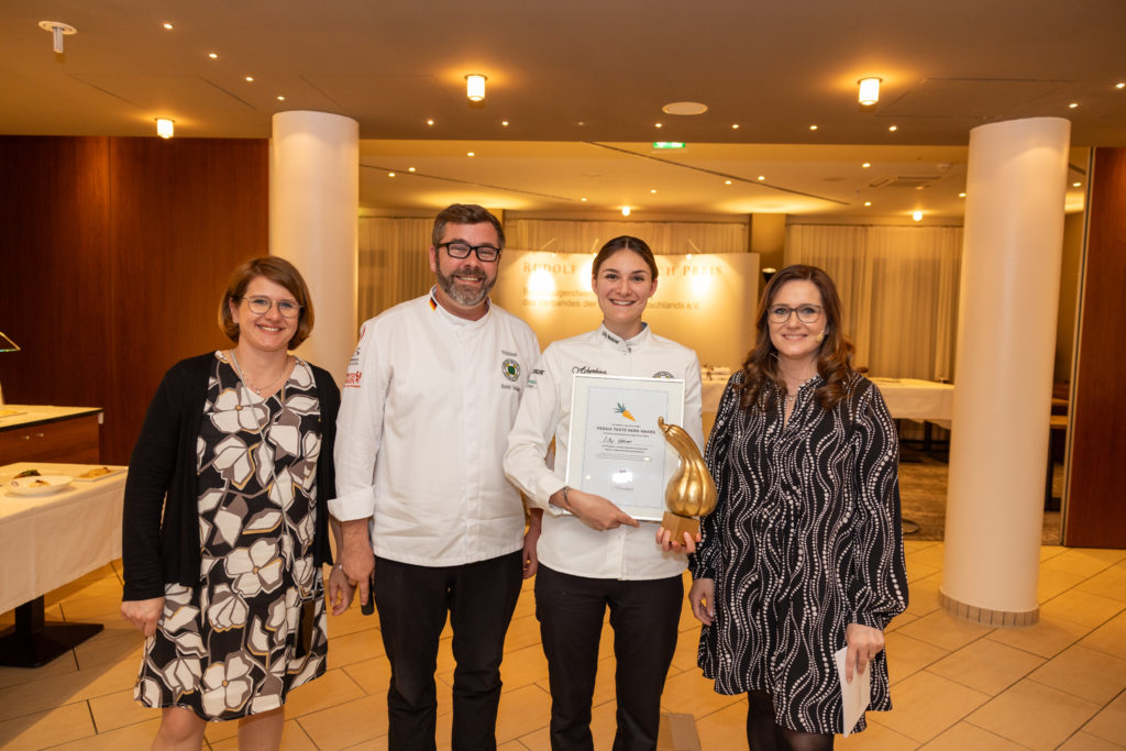 Die größte Herausforderung folgte am nächsten Tag: innerhalb von sechs Stunden ein Vier-Gang-Menü für acht Personen zubereiten – und zwar aus einem bis dato unbekannten Warenkorb mit den Pflichtkomponenten Wachtel und Pastinake in der Vorspeise, Zander und Apfel im Zwischengericht, Portobello, Süßkartoffel und Blumenkohl im Hauptgang sowie Sanddorn-Püree und weißer Schokolade im Dessert. Ganz nach dem Motto: „Wenn schon, dann richtig“ gab es außerdem eine Zusatz-Challenge: Nicht Vorspeise oder Dessert, sondern gleich der Hauptgang sollte vegan zubereitet werden. „Ich glaube, mit so einer Herausforderung schockt man die Auszubildenden heutzutage nicht mehr“, sagt Jurymitglied Hans-Peter Achenbach. „Vor fünf Jahren wäre das vermutlich noch anders gewesen. Pflanzenbasierte Küche spielt inzwischen eine viel größere Rolle in der Kochausbildung und im Berufsalltag. Die Azubis müssen nur aufpassen, dass nicht versehentlich doch etwas nicht-veganes ,reinrutscht‘, wie ein bisschen Butter.“ Dieser Gang war auch ausschlaggebend für die Vergabe des diesjährigen „Veggie Heroes“, einem Award, der 2023 von Antje de Vries für pflanzenbewusstes Denken und Arbeiten ins Leben gerufen wurde. Die goldene Gemüse-Skulptur ging in diesem Jahr an Lilly Wehner vom Hotel Goldener Karpfen in Fulda.