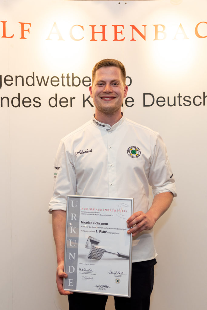 „Nur noch fünf Minuten!“ Die Ansage der Jury ist klar: Gleich müssen die neun Kochazubis liefern – oder besser gesagt: schicken. Die bisher ruhige und konzentrierte Stimmung in der Küche des Best Western Premier IB Hotels Friedberger Warte in Frankfurt am Main wird hektischer, dann geht der erste Teller des Abends über den Pass. Einige Stunden, zahlreiche Teller und insgesamt vier Gänge später steht fest: Nicolas Schramm aus der Hygge Brasserie & Bar in Hamburg hat den Rudolf Achenbach Preis 2024, Bundesjugendwettbewerb des VKD, gewonnen. Mit seinem Sieg holt der 24-Jährigeden Titel nach 21 Jahren wieder in den VKD-Norden – und tritt damit in die Fußstapfen von TV-Berühmtheit und Gastronom Tim Mälzer aus Hamburg, der vor exakt 30 Jahren den prestigeträchtigen Wettbewerb gewann. Beim Finale am 27./28. April setzte sich Nicolas Schramm gegen seine acht Mitstreiter:innen aus den anderen VKD-Landesverbänden durch. Das Siegertreppchen teilt sich der Kochazubi mit Jason Kröker vom Landhaus Begatal in Dörentrup, der den zweiten Platz belegte, und Jenny Stier vom Betriebsrestaurant der Anton Häring KG in Bubsheim auf Platz drei.