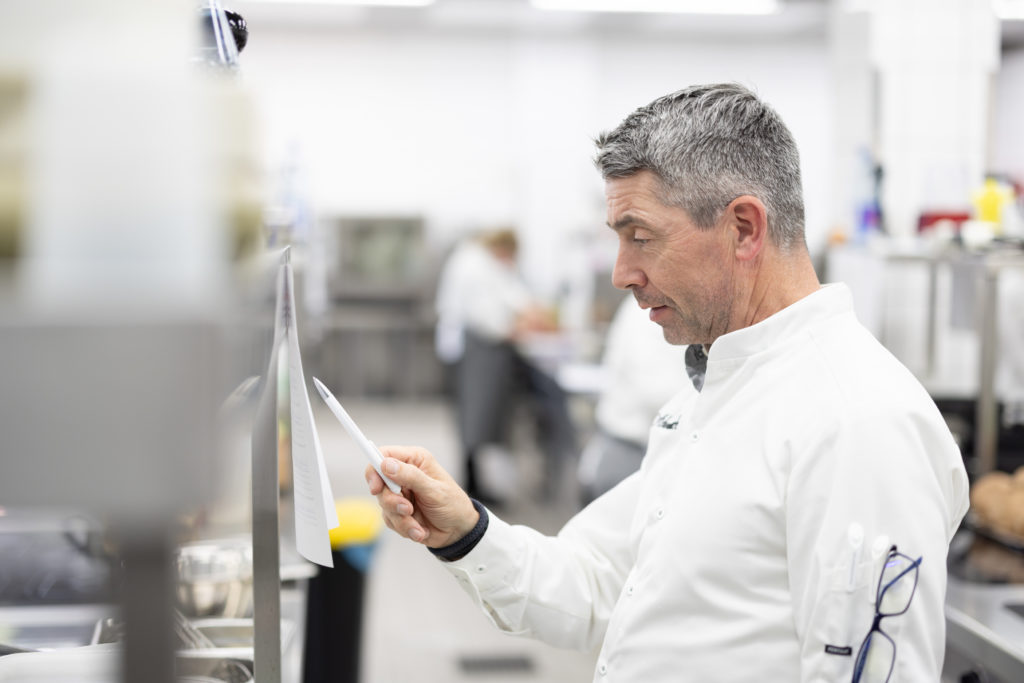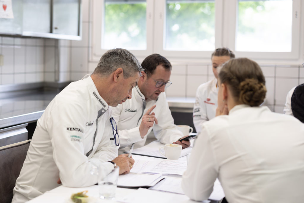Im Fokus von Jury A, zu der neben Hans-Peter Achenbach auch Michael Nehrdich und Sophia Birlem gehörten, standen unter anderem die Arbeitsweise und das Timing in der Küche. „Der Rudolf Achenbach Preis ist ein guter Testlauf für die Abschlussprüfung“, weiß Sophia Birlem. „Die Teilnehmenden können hier vor allem ihr Zeitmanagement kontrollieren. Außerdem bietet der Wettbewerb eine hervorragende Möglichkeit zum Networken und Kontakte knüpfen, die die Azubis unbedingt wahrnehmen sollten.“ Mit dem Timing hatte auch Nicolas Schramm zu kämpfen. „Das Zeitmanagement war definitiv meine größte Herausforderung beim Kochen“, sagt der Sieger. „All das, was ich mir vorgenommen hatte, in der vorgegebenen Zeit auf den Teller zu bringen und mit unvorhersehbaren Komplikationen umzugehen, war keine leichte Aufgabe.“ Am Ende begeisterte er die Jury vor allem mit seinen ausgefeilten Kreationen. „Bei einigen Gerichten sieht man deutlich, dass die Teilnehmenden schon beim Schreiben des Menüs ganz genau gewusst haben, wie der Teller am Ende aussehen wird“, ist sich die Tasting-Jury B einig. Burkhard Weizsäcker, Max Zibis und Nadin Pospech-Demmler hatten den Tag über Küchen-Verbot und bewerteten die Teller, ohne zu wissen, wer diese zubereitet hat. „Die Finalistinnen und Finalisten haben insgesamt Gerichte auf hohem Niveau abgeliefert. Trotzdem sind merkbare Unterschiede in Geschmack, Anrichteweise und Kreativität zu erkennen.“