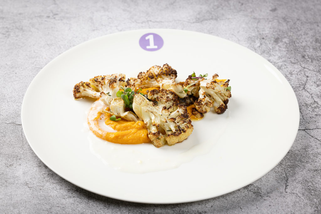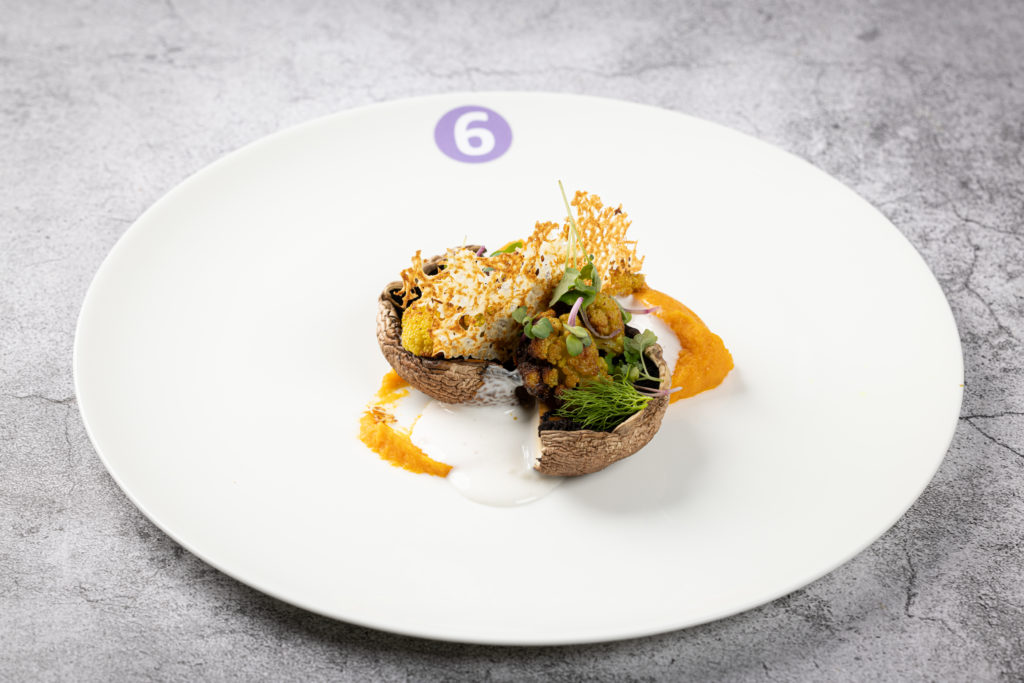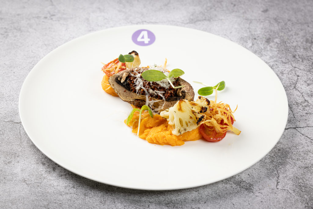 Veganer Hauptgang von Nicolas Schramm: Portobello mit Parmesankräuterkruste, Pilzjus, geröstetem Blumenkohl und gebackener Süßkartoffel