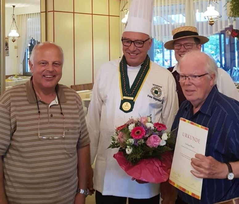 Hundert Jahre Verbandsmitgliedschaft – so viel bringen Gerhard Bauer und Joseph Gründler gemeinsam auf die Uhr. Beim Grillfest des Clubs der Köche Südpfalz e. V. Mitte August im Schweigener Hof in Schweigen-Rechtenbach wurden sie dafür geehrt. Gerhard Bauer, der auch Mitglied im VKD-Ehrensenat ist, wurde zu 60, Joseph Gründler zu 40 Jahren Mitgliedschaft im VKD beglückwünscht. Die Ehrungen wurden von Landesverbandsvorsitzenden West, Peter Siegmund, überreicht. Anschließend feierten die rund 40 Kolleginnen und Kollegen bei Sonnenschein, Essen und Getränken.