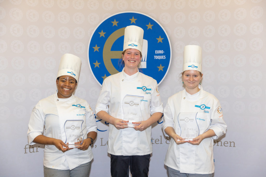 Die Besten der Euro-Toques-Challenge 2021: Siegerin und VKD-Mitglied Anne Brandes, die Zweitplatzierte Vanessa Kirchner (re.) und Anesu Mitchel Mutamaenda auf Platz 3. Foto: Ingo Hilger