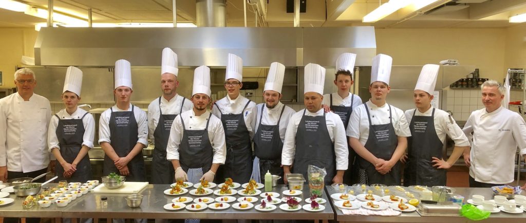 Am zweiten Tag bereiteten die Teilnehmer die geplanten Menüs in der Lehrküche der Berufsschule in Cuxhaven zu. Geladene Gäste durften sich in der Küche von der Leistungsfähigkeit des Nachwuchses in Form einer Küchenparty überzeugen lassen. Alle Gerichte wurden als Mini-Portionen vor den Gästen angerichtet. Denen schmeckte es nach Aussage von Mario Schnieders, Bezirksleiter von Dr. Oetker Professional, hervorragend.