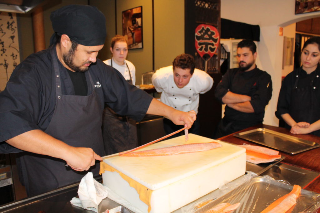 Im Verlauf des Nachmittages lernten die Auszubildenden japanische Schnitttechniken, das Filetieren eines Lachses von der Bauchseite, die Herstellung des typischen süßen Omeletts, verschiedene Qualitäten von Thunfisch, Nori Blätter, Dashifonds und viele andere Geheimnisse der japanischen Küche kennen. Nachdem die gesamten Vorbereitungen abgeschlossen waren, ging es gegen Ende des Seminars an die Herstellung der verschiedenen Formen von Sushi. Toshi Suzuki erklärte den Azubis die Herstellung von Sashimi, Maki, Uramaki und Nigiri. Der Referent legte hier großen Wert auf die komplette Verarbeitung der Ware und erklärte den Nachwuchsköchen den japanischen Gedanken in Bezug auf den Umgang mit den einzelnen Produkten. Schließlich konnten die Azubis das Sushi auch verkosten.