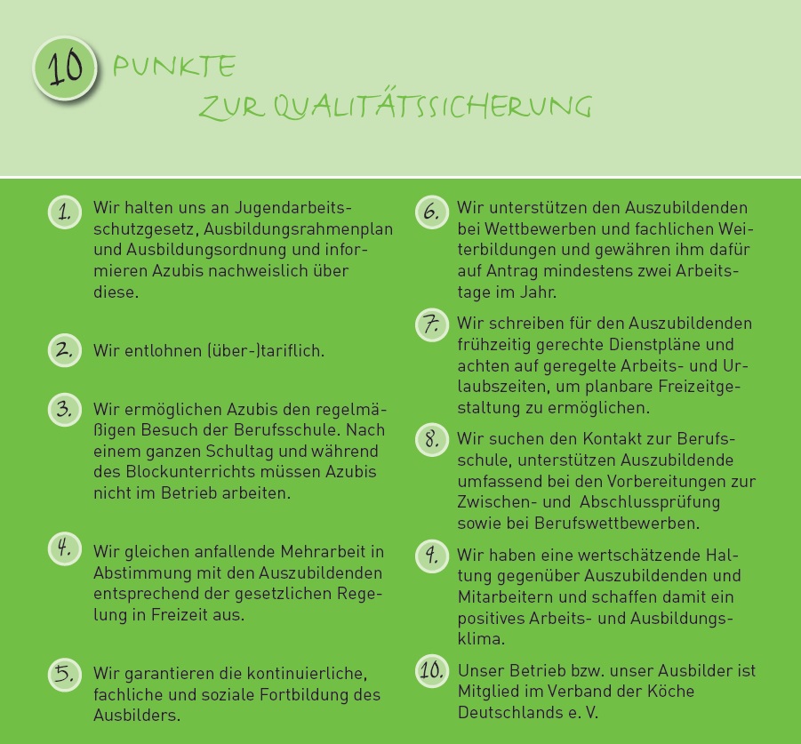 Betriebe, die als „Qualifizierter Ausbildungsbetrieb“ ausgezeichnet sind, zeigen: Wir erfüllen alle Anforderungen an eine gute Ausbildung, eine gute Arbeitsumgebung und eine gute Unterstützung des Auszubildenden. In zehn Punkten zur Qualitätssicherung hat der Verband der Köche Deutschlands e. V. definiert, was eine gute Ausbildung ausmacht.
