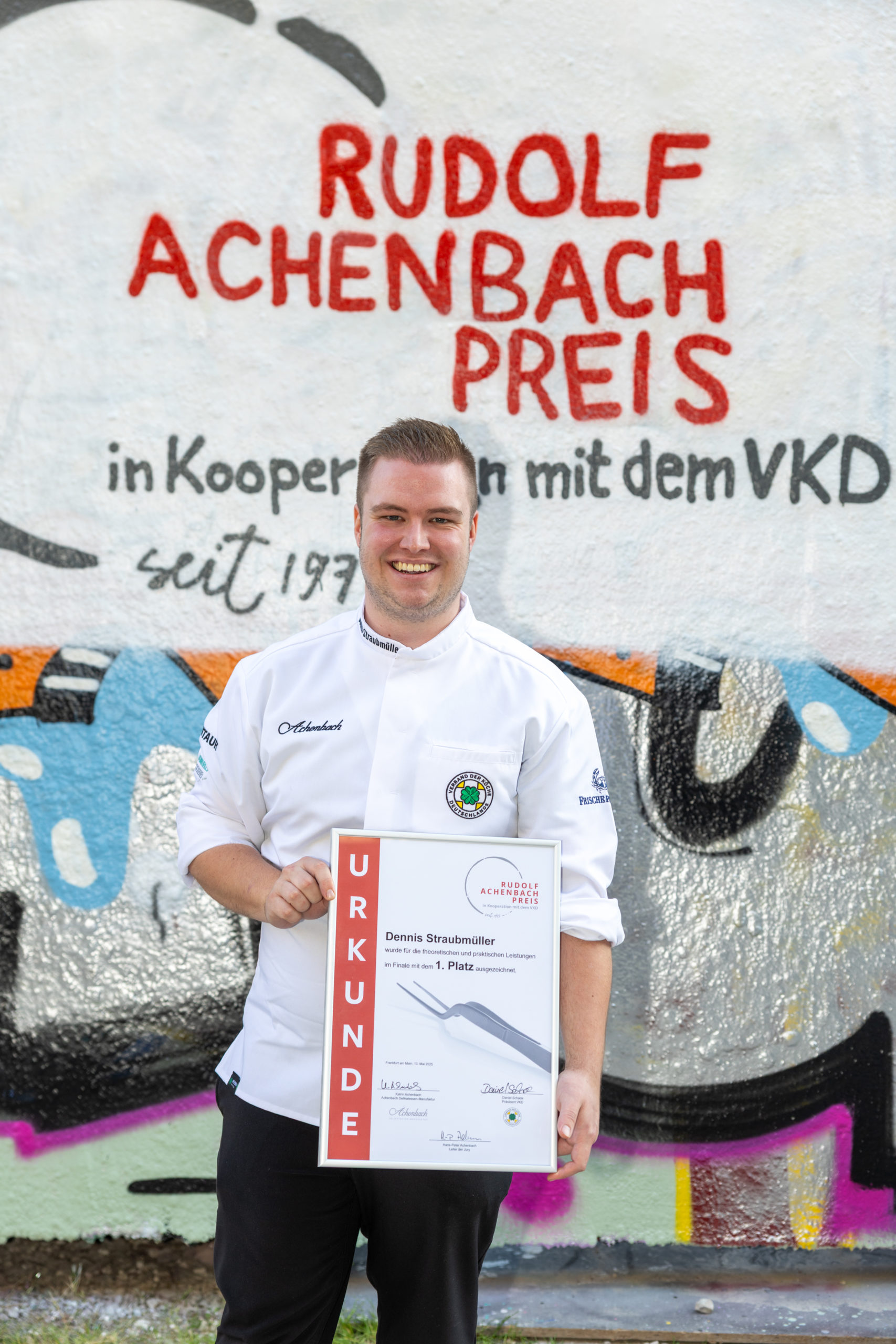 Dennis Straubmüller, Auszubildender im Posthotel Alexander Herrmann (Wirsberg) hat sich beim renommierten Rudolf Achenbach Preis 2025 den ersten Platz gesichert. In einem spannenden Finale setzte sich der 24-Jährige im zweiten Ausbildungsjahr gegen Moritz Range (23) vom Hotel Traube Tonbach (Baiersbronn) und David Stadler (21) von Brenners Park-Hotel & Spa (Baden-Baden) durch – beide ebenfalls mit beeindruckenden Leistungen.