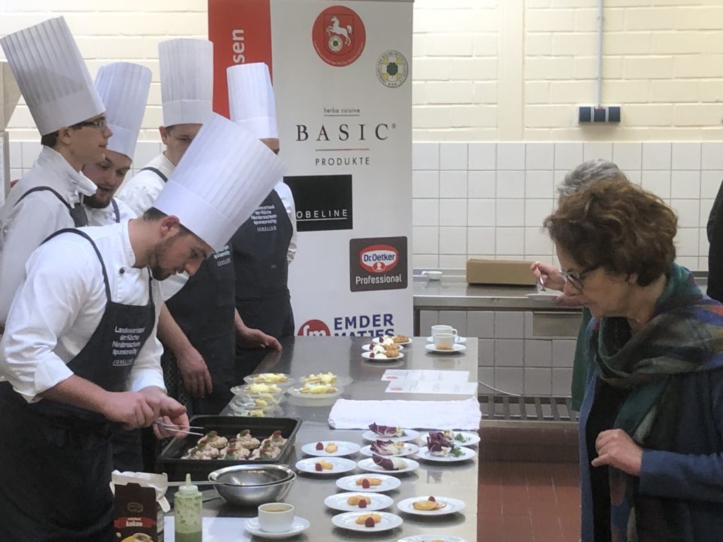 Am zweiten Tag bereiteten die Teilnehmer die geplanten Menüs in der Lehrküche der Berufsschule in Cuxhaven zu. Geladene Gäste durften sich in der Küche von der Leistungsfähigkeit des Nachwuchses in Form einer Küchenparty überzeugen lassen. Alle Gerichte wurden als Mini-Portionen vor den Gästen angerichtet. Denen schmeckte es nach Aussage von Mario Schnieders, Bezirksleiter von Dr. Oetker Professional, hervorragend.