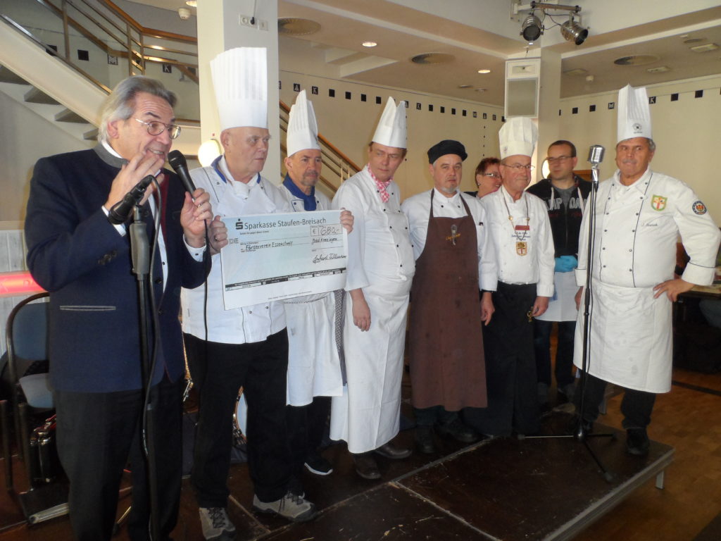 350 Obdachlose der Stadt Freiburg durften sich am Dreikönigstag über einen Festtagsschmaus freuen. Mitglieder des Ordens des St. Laurentius e.V. – der sogenannten Laurentius-Bruderschaft – bereiteten ein dreigängiges Menü bestehend aus einer Champignoncremesuppe, einer Gänsekeule mit Apfelrotkraut und Kartoffelknödel sowie einem Eisbuffet zu. Im Anschluss gab es Kaffee sowie Torten und Kuchen. Musikalische Begleitung bot die Horst Zahner-Band. Gesponsort wurde das gesamte Menü von der Laurentius-Bruderschaft, deren Mitglieder sich bereits seit 21 bereiterklären, ihren Feiertag für diese ehrenamtliche Arbeit zu opfern. Diesen festlichen Rahmen nutzten die Mitglieder der Laurentius-Bruderschaft auch, um einen Scheck in Höhe von 680 Euro von der Spargelschälaktion 2019 an die Vorstandschaft vom Förderverein Essenstreff e.V. zu überreichen.