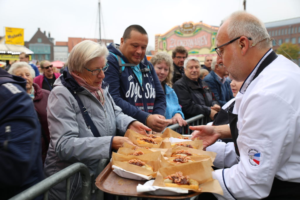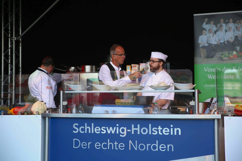 Grundsätzlich gehen die Westküste-Köche auch gern mal in die Öffentlichkeit und zeigen dort ihr Können: Ein echtes Highlight im Nordkalender sind die Husumer Krabbentage, die immer im Oktober am Husumer Hafen stattfinden – in diesem Jahr bereits zum 22. Mal. Der Köcheverein engagiert sich dort auf seiner eigenen Showbühne, bringt Nachwuchsköche zum Kochen und zeigt kreative Ideen rund um die Krabbe. So kam 2018 der erste Husumer Krabben-Hot Dog zum Einsatz und in diesem Herbst war es ein kräftiger Krabbenschnüsch – frei übersetzt ein „Holsteiner Eintopf mit Zutaten einmal quer durch den Garten“.