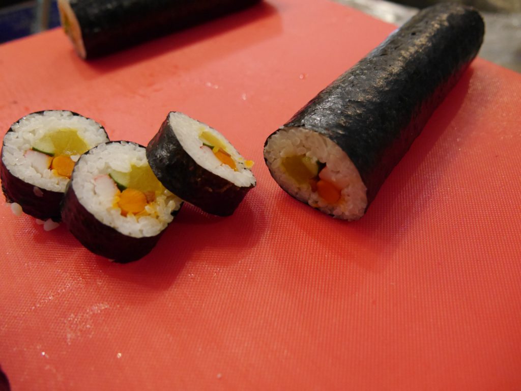 Schweinefleisch und Lauch; „Die besten in ganz Südkorea.“) oder Glasnudeln aus Süßkartoffeln, Gimbap (eine Reisrolle, wie Sushi, aber ohne Fisch).