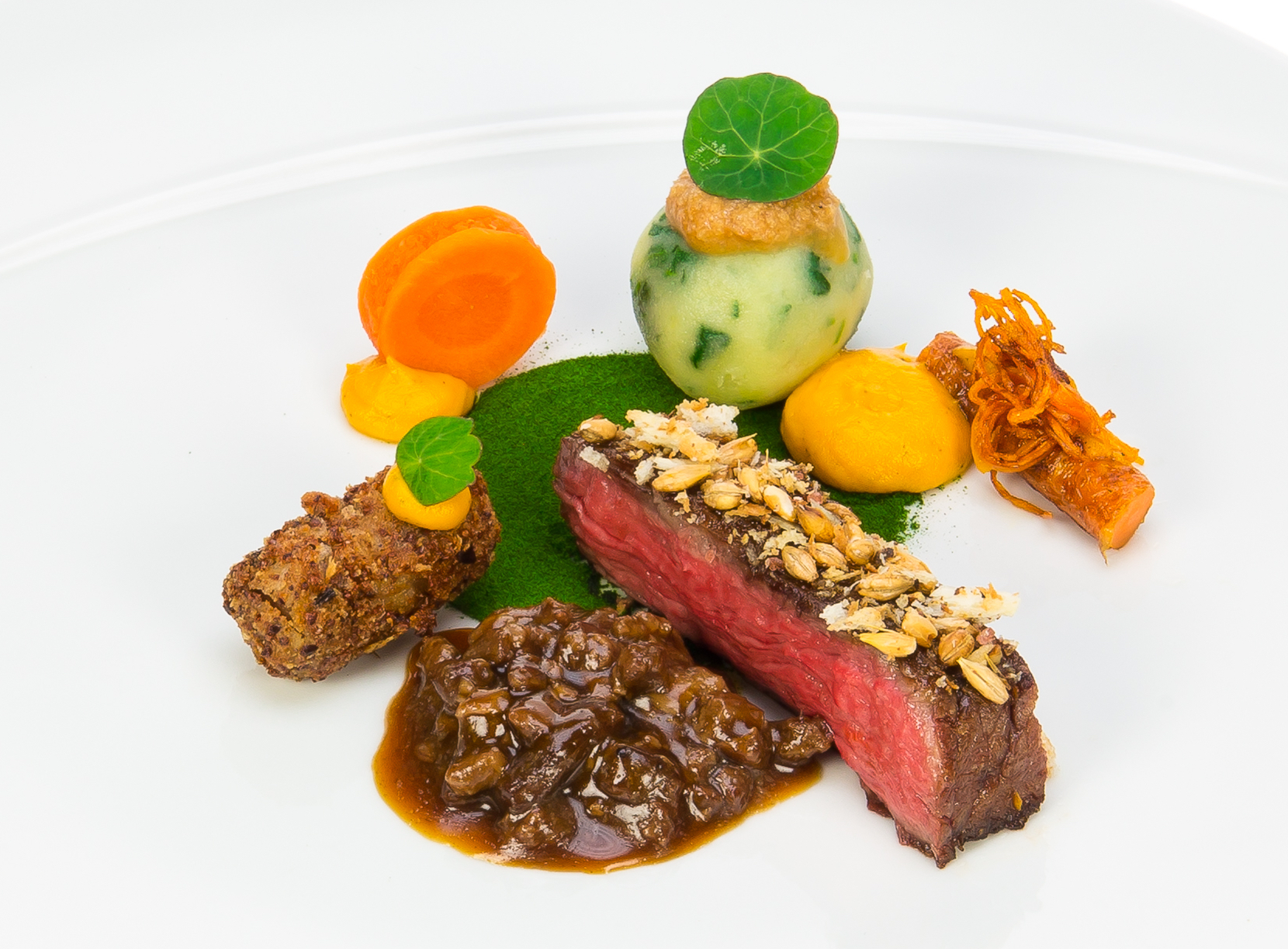 Gebratenes Flanksteak mit Sauermalzknusper,
