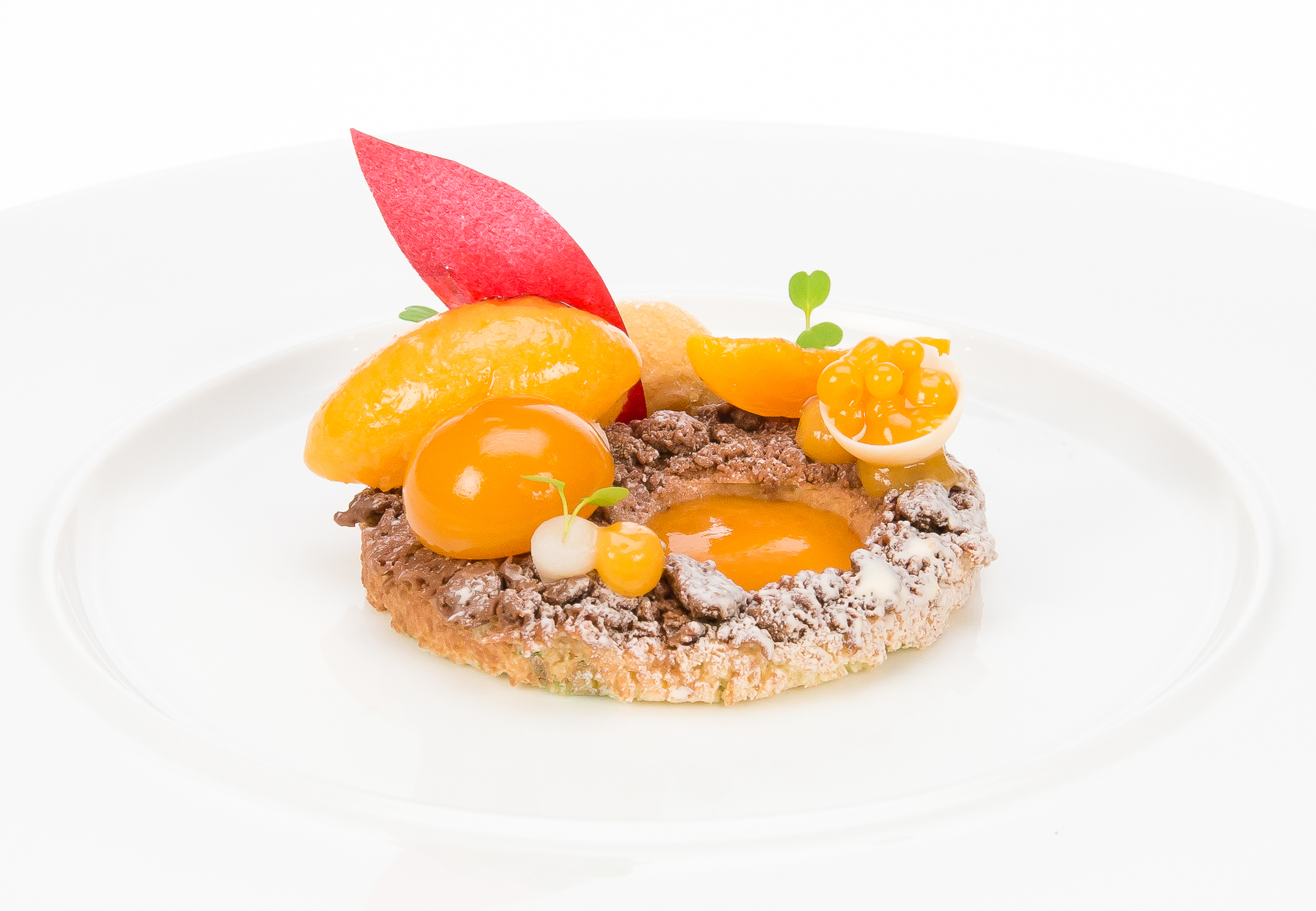 Nougat Mousse with Brittle and Apricot Brandy Gel, Yoghurt Apricot Ball,