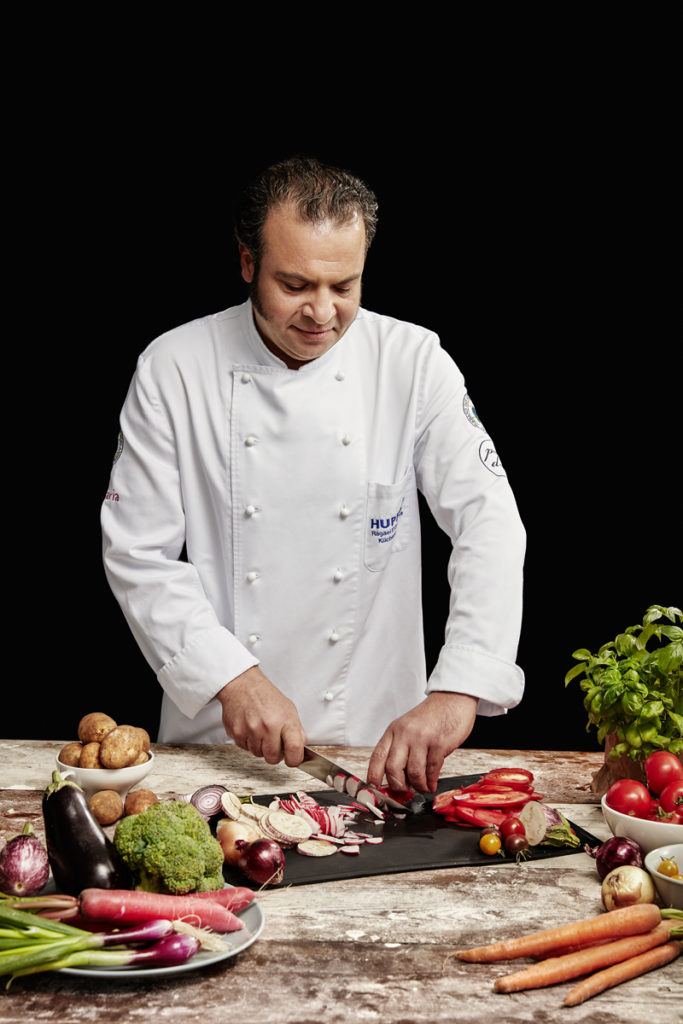 Seit einigen Jahren arbeite ich in der Backhaus Kinder- und Jugendhilfe. Dort gebe ich meine Leidenschaft fürs Kochen, die Freude an verschiedenen Geschmäcken und die Liebe zu Lebensmitteln an minderjährige Jugendliche weiter. Eigentlich bin ich dort mehr als ‚nur‘ Koch. Viele der Jugendlichen sind Flüchtlinge. Durch meine eigenen Fluchterfahrungen kann ich sehr gut nachvollziehen, wie sie sich fühlen. Und es ist ein großer Vorteil, dass ich Arabisch spreche und Moslem bin. Da kann ich oft gut vermitteln und Dinge erklären. Dabei versuche ich auch, den Jugendlichen zu verdeutlichen, wie wichtig Nachhaltigkeit ist. Bei uns werden kaum Lebensmittel weggeschmissen. Ich passe auf, dass der Kühlschrank nicht offen steht und das Wasser nicht einfach so läuft. So sparen wir auch Energie. Und ich setze sehr auf den Einsatz von regionalen Lebensmitteln. Ich glaube, dass wir Köche durch nachhaltiges Arbeiten zumindest ein wenig dazu beitragen können, die Welt ein bisschen besser zu machen.“