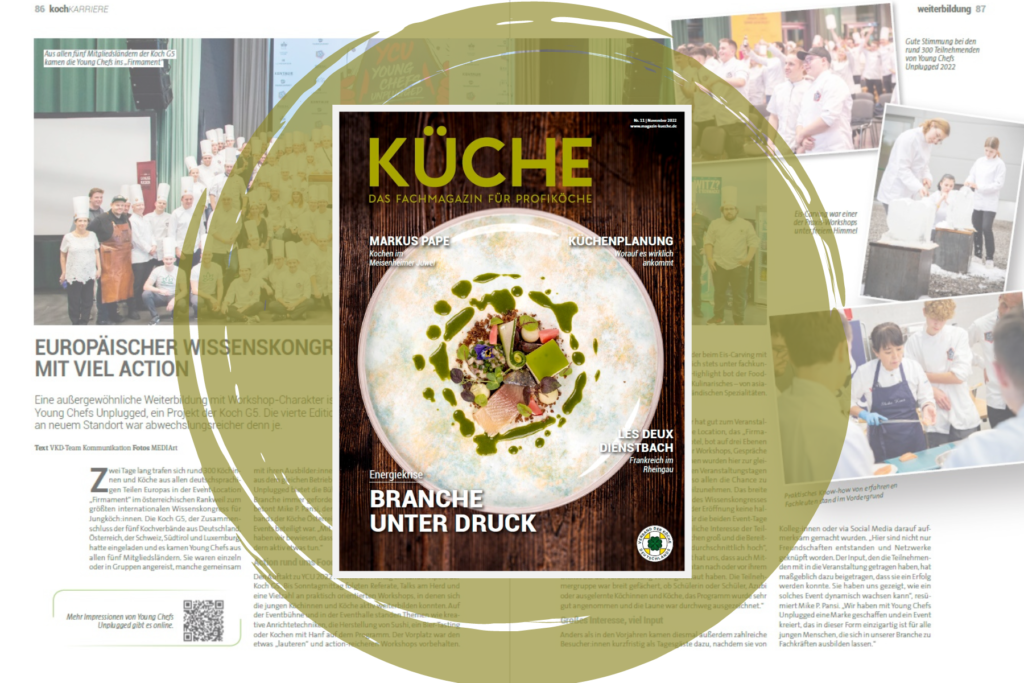 Ebenfalls in der November-KÜCHE: ein Besuch bei VKD-Mitglied Markus Pape, kreative Ideen für vegane Desserts und ein Rückblick auf die vierte Ausgabe von Young Chefs Unplugged. Außerdem geben VKD-Vizepräsidentin Marketa Schellenberg und Kolleg:innen Einblicke in die ayurvedische Küche.