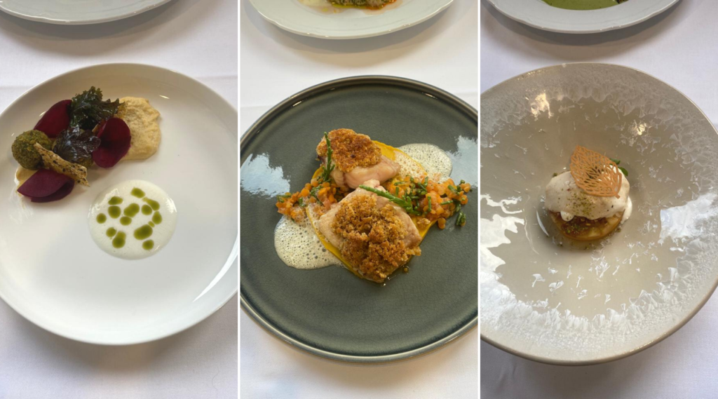 • Linsencreme mit Harissa | Linsensalat mit Queller | Wels mit Dukkah-Pinienkern-Kruste | getrocknete Tomaten | Portweinschaum