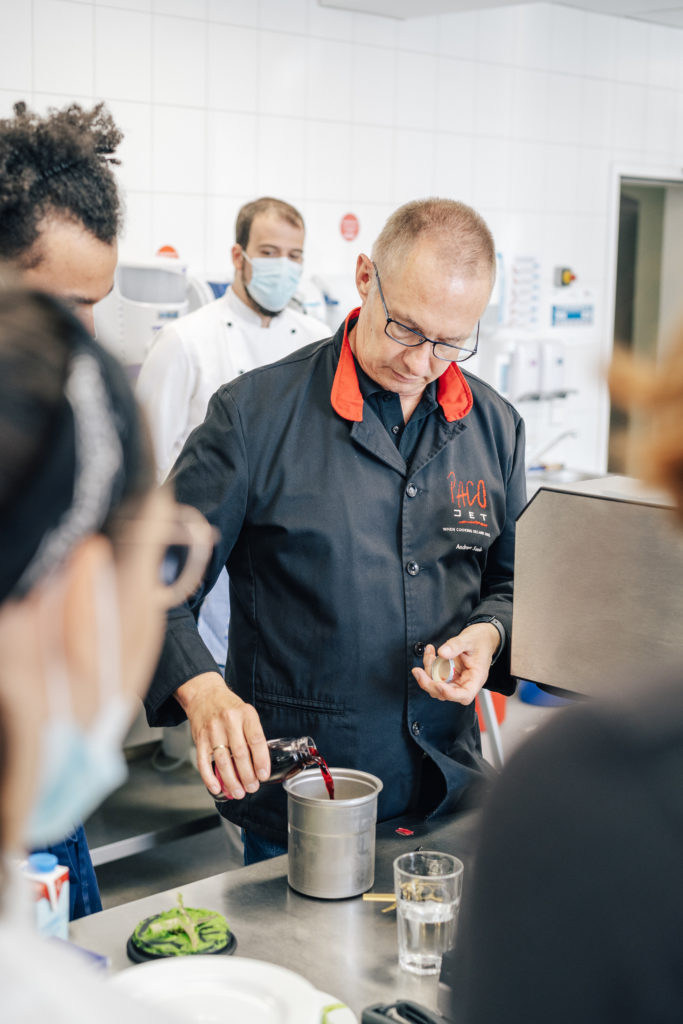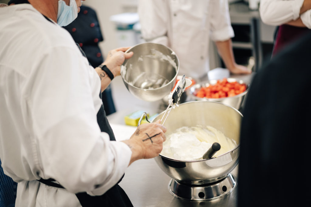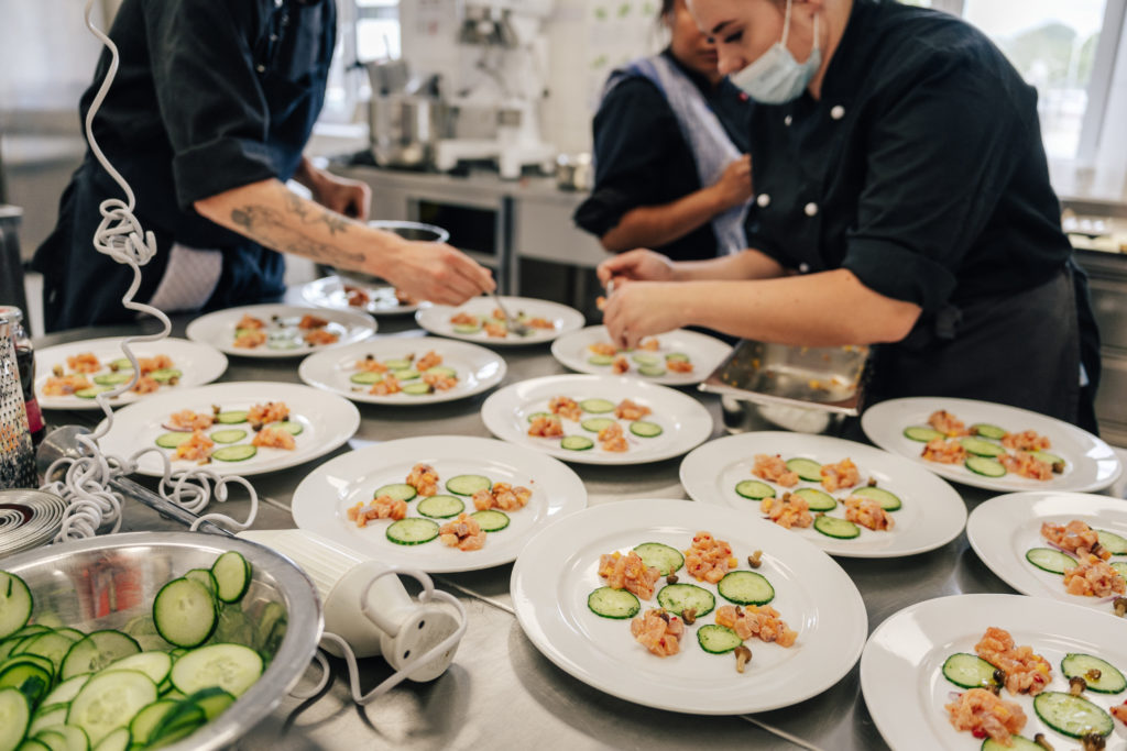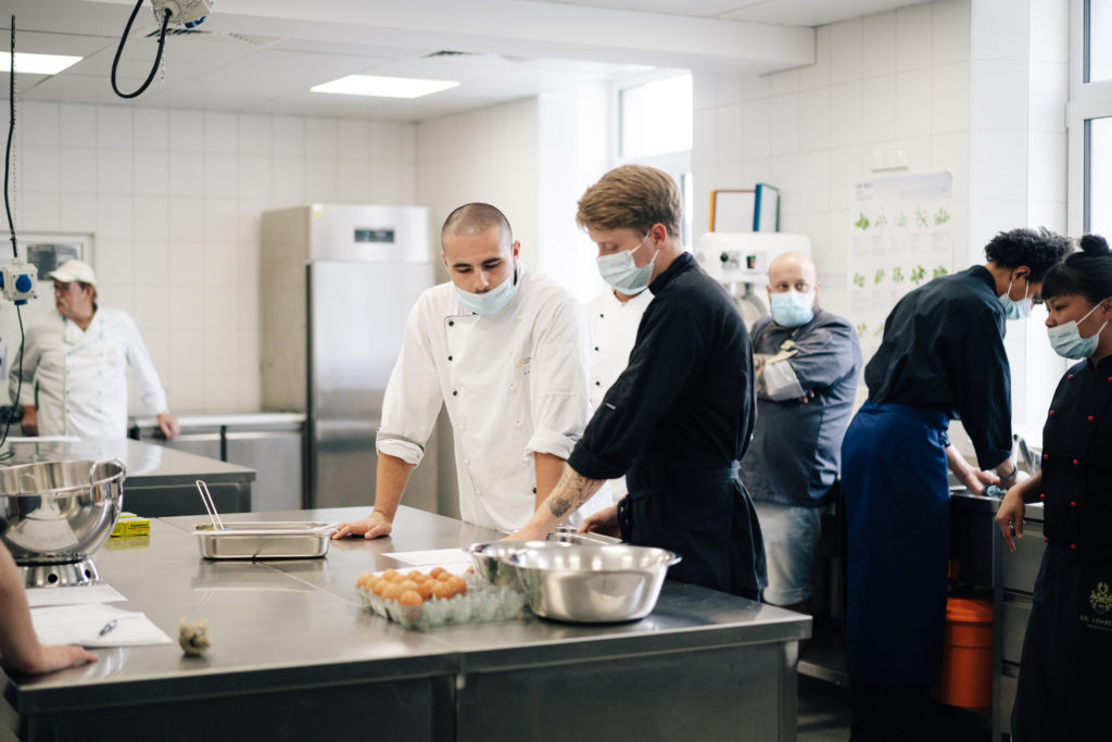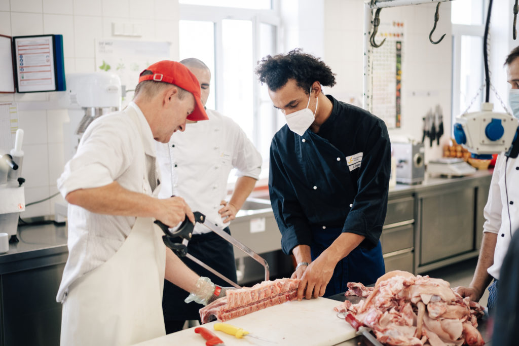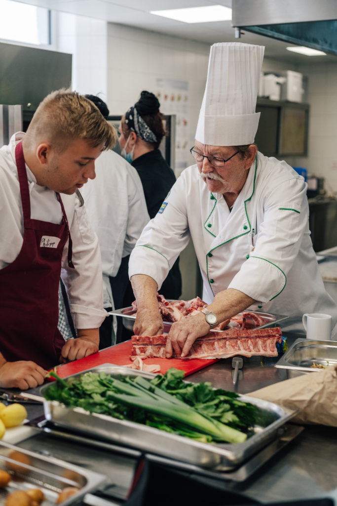 Heiß her ging es in der Küche des Restaurants Junkers 23 im BTZ Gießen. Die Wirkungsstätte von LV-Vorstandsmitglied Martin Braun stand an allen drei Tagen zur Verfügung. Beim Workshop einer regionalen Metzgerei zerlegten die Azubis ein halbes Schwein. Die frischen Steaks und selbstgemachten Bratwürste wurden dann abends in gemütlicher Runde zusammen gegrillt. Zudem gab es einen Workshop zum Pacossieren und Kochkollege Eric Lehr zeigte sein Können in der Patisserie. Er half den Azubis dabei, ein Dessert zu kreieren und anzurichten. Zum Abschluss des Jugendcamps kochten die Teilnehmenden ein Drei-Gang-Menü. Fazit: sehr lecker.