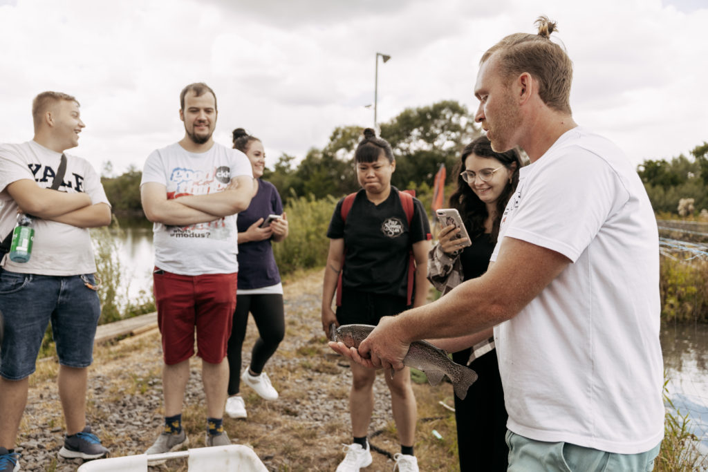 Aufmerksame Zuhörer:innen in der nachhaltigen Fischzucht. Foto: Chris Dietz Fotografie