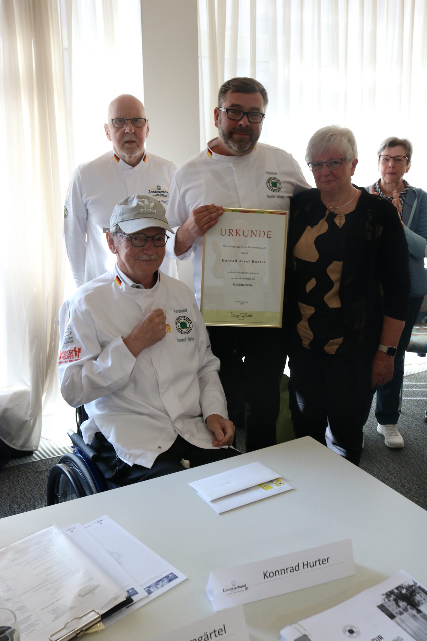 Ein emotionaler Höhepunkt war die Verabschiedung von Konrad „Konni“ Hurter. Thomas Ballmann würdigte dessen langjähriges Engagement in einer bewegenden Rede. Konrad Hurter erhielt als Auszeichnung die Goldmedaille des Verbandes. Auch seine Frau Jutta wurde mit einem Blumenstrauß geehrt. Ein Geschenk der Metro, überreicht durch Kathrin Eckert, unterstrich die Wertschätzung aus dem Kreis der Sponsoren. Sichtlich gerührt bedankte sich Konrad Hurter für die Unterstützung während seiner Erkrankung.