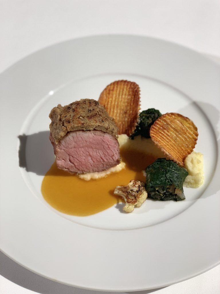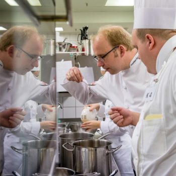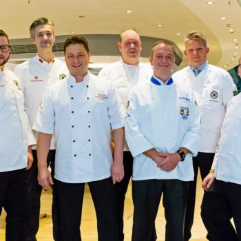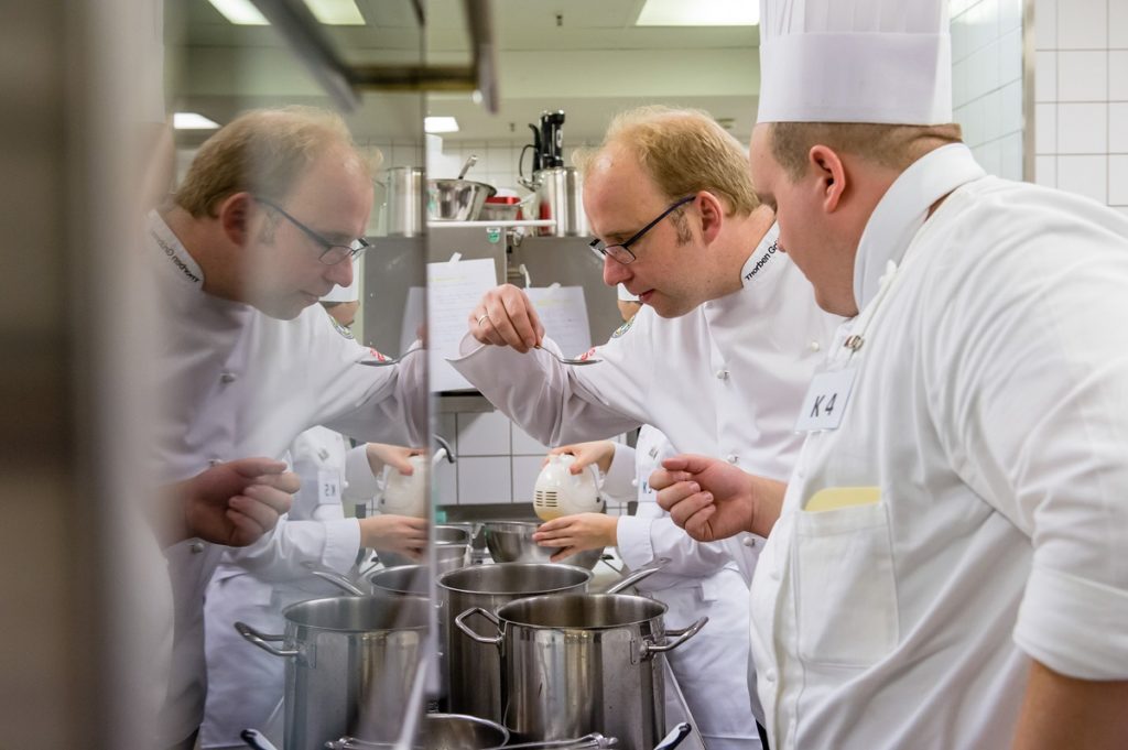 An Motivation mangelte es den diesjährigen Teilnehmern jedenfalls nicht, auch wenn die Anforderungen in der Küche nicht ganz ohne waren: Neben einem umfangreichen Theorieteil galt es in der Praxis, aus einem zuvor unbekannten Warenkorb innerhalb von einer Stunde ein fachlich einwandfreies Vier-Gang-Menü zu entwerfen und dieses am Folgetag für zehn Personen zu kochen. Die Auswahl des Warenkorbs oblag auch diesmal wieder Roland Kestel, der seit mehr als zehn Jahren der Fachjury Küche vorsteht. „Für die Suppe war diesmal Ochsenschwanz gefordert, keine leichte Aufgabe“, so der erfahrene Prüfer. „Das haben wir schon bei der Theorieprüfung festgestellt, als dieses Produkt auch bei der Warenerkennung gefragt war.“ Weiteres aus dem Warenkorb: Wachtel und Poularde für die Vorspeise, Kalbscarré im Hauptgang und Honig, Birne sowie Äpfel im Dessert.