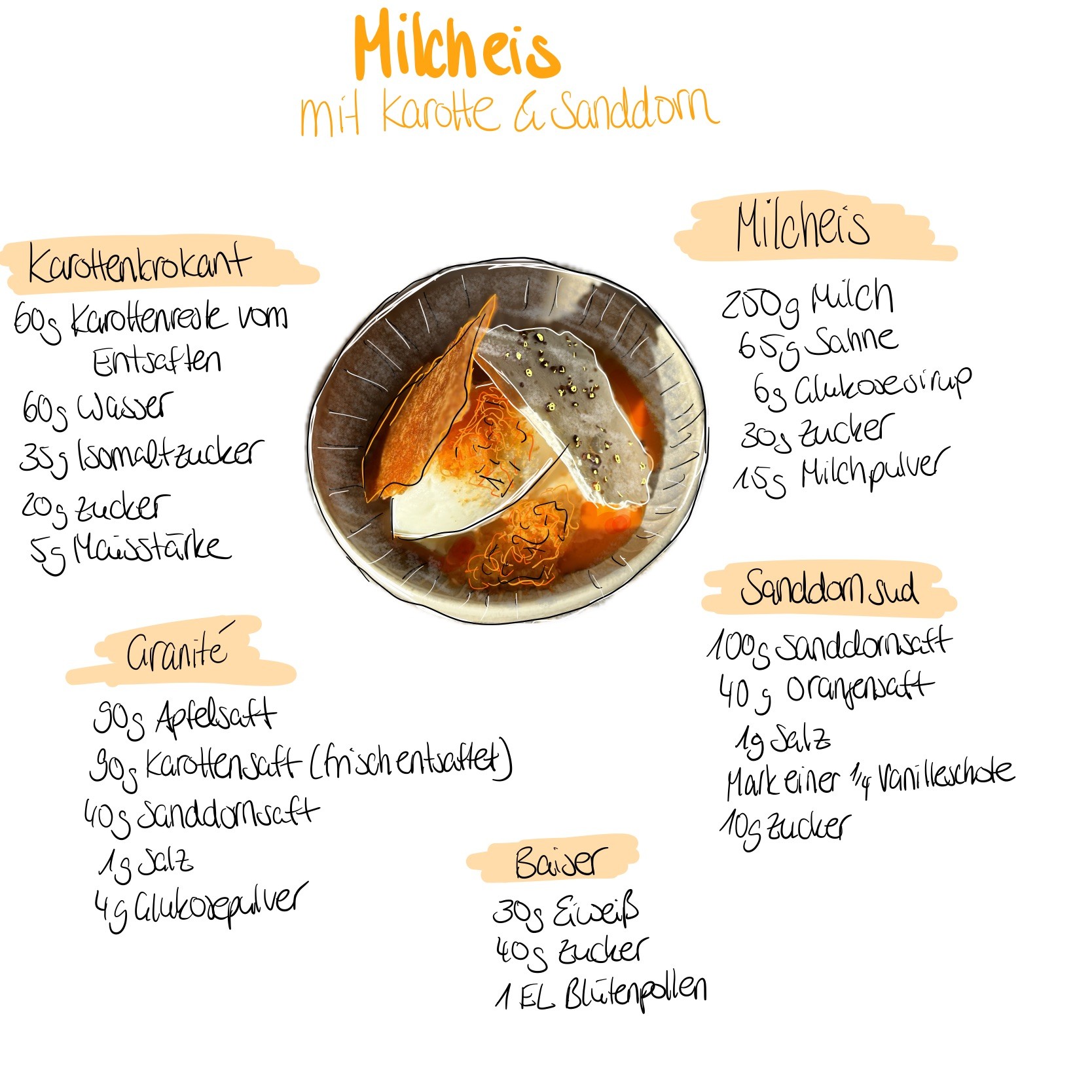 Nach dem Ende ihrer Zeit im Nationalteam hat Sarah ein neues Herzensprojekt in ihrer Freizeit gestartet: den Instagram-Account @butter_plaetzchen, auf dem sie ihre Dessertideen teilt – oft auch in veganer Variante. Leckereien wie Clafoutis mit Erdbeeren und Himbeeren, Vanilleeis mit Basilikum und Meersalz oder Milcheis mit Karotte und Sanddorn sind nur einige Beispiele. Die Idee kam spontan: „Wir machen mit Freunden regelmäßig ein ‚perfektes Dinner‘. Ich bin die Einzige vom Fach, alle fragen mich nach Rezepten. Nach ein paar gemeinsamen Gläsern Aperol kam dann die Idee zum Account. Die Rezepte sind bewusst so angepasst, dass man sie auch ohne Profiküche zu Hause nachmachen kann. Auch das Design stammt von Sarah selbst. „Ich habe früher immer Tellerzeichnungen gemacht – für Wettbewerbe oder den Betrieb. Mein Mann fand das toll, jetzt male ich die Grafiken für die Posts selbst auf dem Tablet.“ Und was bringt die Zukunft? „Wenn ich den Mut irgendwann finde, hätte ich gerne ein eigenes kleines Café mit Frühstück, Lunch, Kuchen und ab und zu Themenabenden. Auf jeden Fall möchte ich weiterhin am Herd stehen.“