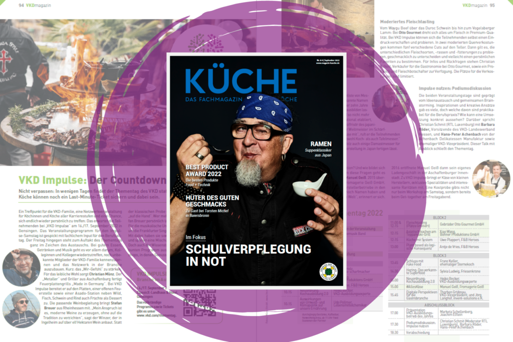 Das VKD-Magazin ist fester Bestandteil jeder KÜCHE-Ausgabe. Diesmal steht das Veranstaltungsprogramm des Thementags „VKD Impulse“ besonders im Fokus. Außerdem ein Beitrag über Neubeantragungen und Verlängerungen des VKD-Siegels „Qualifizierter Ausbildungsbetrieb“, Eindrücke vom Training der Köchenationalmannschaft in Köln und ein Ausblick auf Young Chefs Unplugged im Oktober. Zudem werfen wir einen Blick in den Seminarplan, berichten aus den VKD-Zweigvereinen Chemnitz und Nürnberg und stellen den Köcheverein Baden-Baden e. V. als Zweigverein des Monats vor.