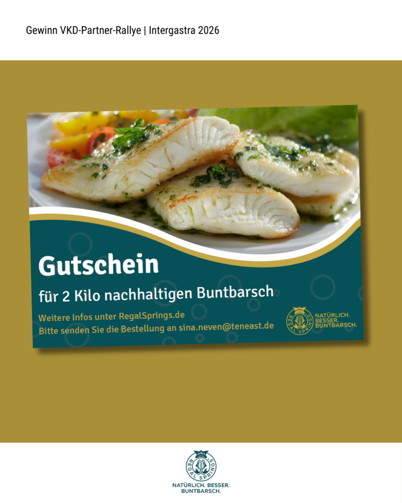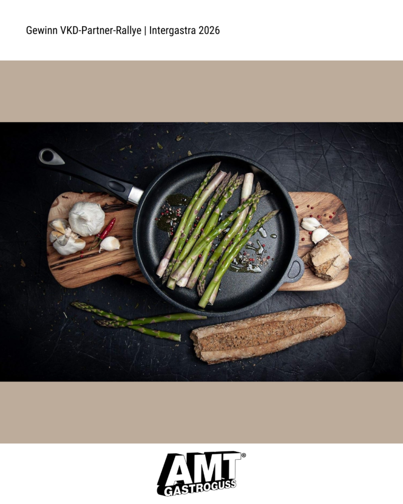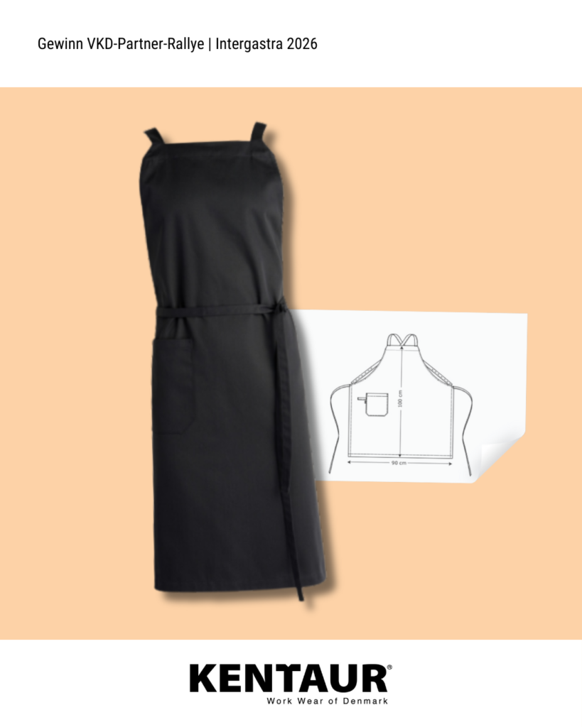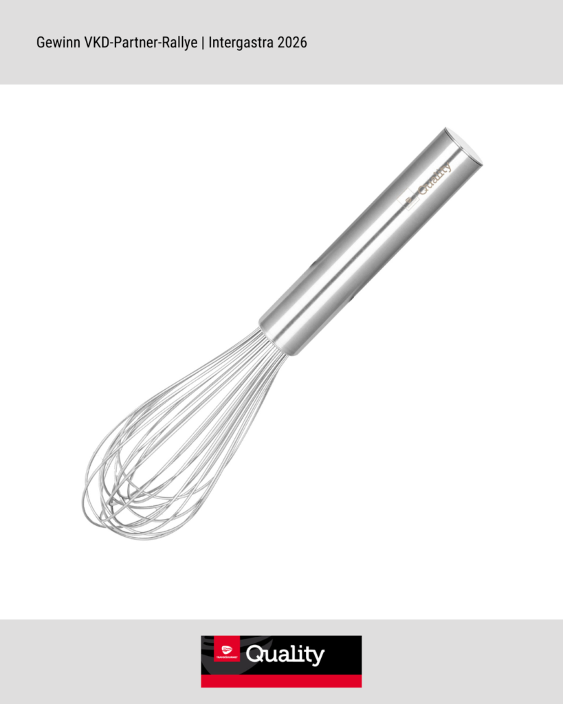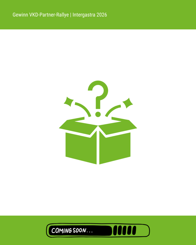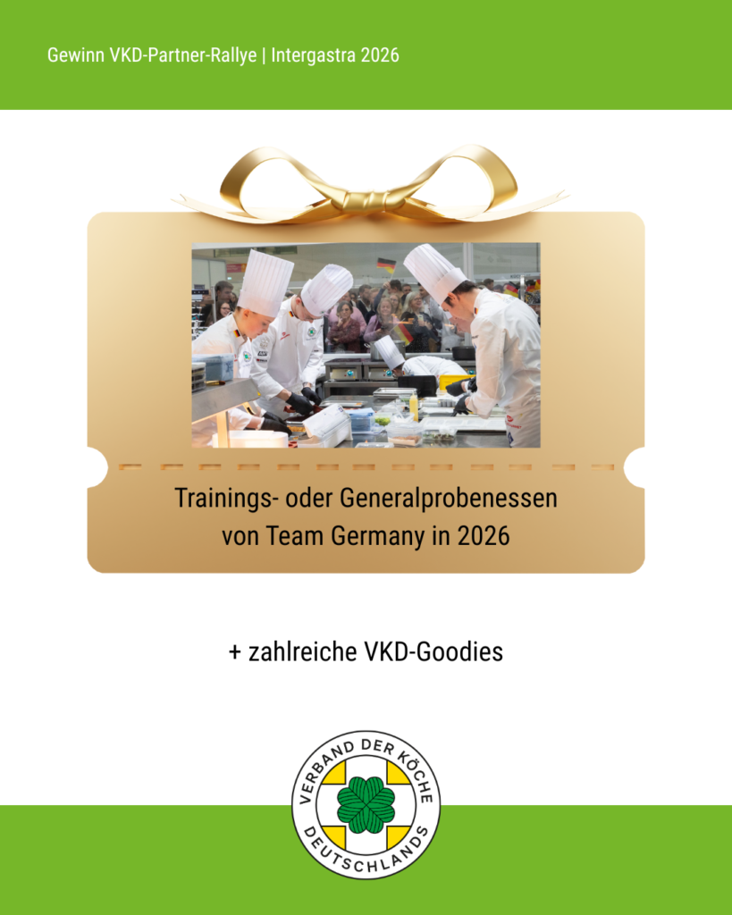 Vom 7. bis 11. Februar 2026 öffnet die Intergastra, die Leitmesse für Hotellerie und Gastronomie, auf dem Messegelände Stuttgart wieder ihre Tore. Der VKD ist auch in diesem Jahr mit einem eigenen Stand in der Dehoga-Halle 7 vertreten und lädt Mitglieder sowie Interessierte herzlich zum Austausch ein. Ein Highlight ist die VKD-Partner-Rallye, eine interaktive Mitmach-Aktion während der Messe. VKD-Mitglieder besuchen dabei mindestens zwei Stände von VKD-Partnern, machen an jedem Stand ein Selfie und zeigen diese anschließend am VKD-Stand vor. Damit sichern sie sich einen Platz im Lostopf. Insgesamt werden nach der Messe drei Gewinner:innen per Zufallsprinzip ermittelt. Die Gewinnpakete umfassen hochwertige Sachpreise der Sponsoren wie Pfannen, Küchengadgets oder Schürzen (siehe Ende des Beitrags), je zwei Tickets für ein Trainings- oder Generalprobenessen von Team Germany sowie verschiedene VKD-Goodies.
