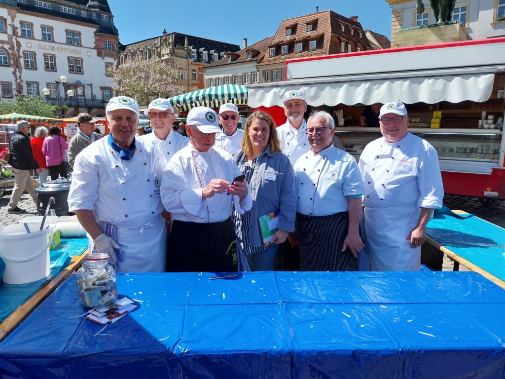 Am Samstag vor Muttertag veranstaltete der Club der Köche Südpfalz e. V. seine jährliche Spargelschälaktion auf dem Landauer Rathausplatz. Bei sonnigem Wetter schälten Vereinsmitglieder um Vorsitzenden Fritz Lindemann kostenlos Spargel, den die Besucher:innen zuvor auf dem Wochenmarkt gekauft hatten.