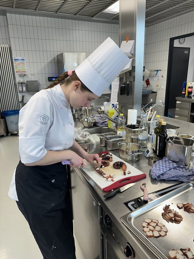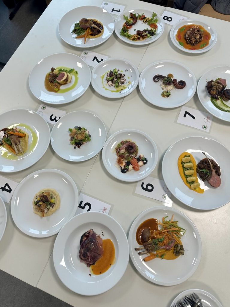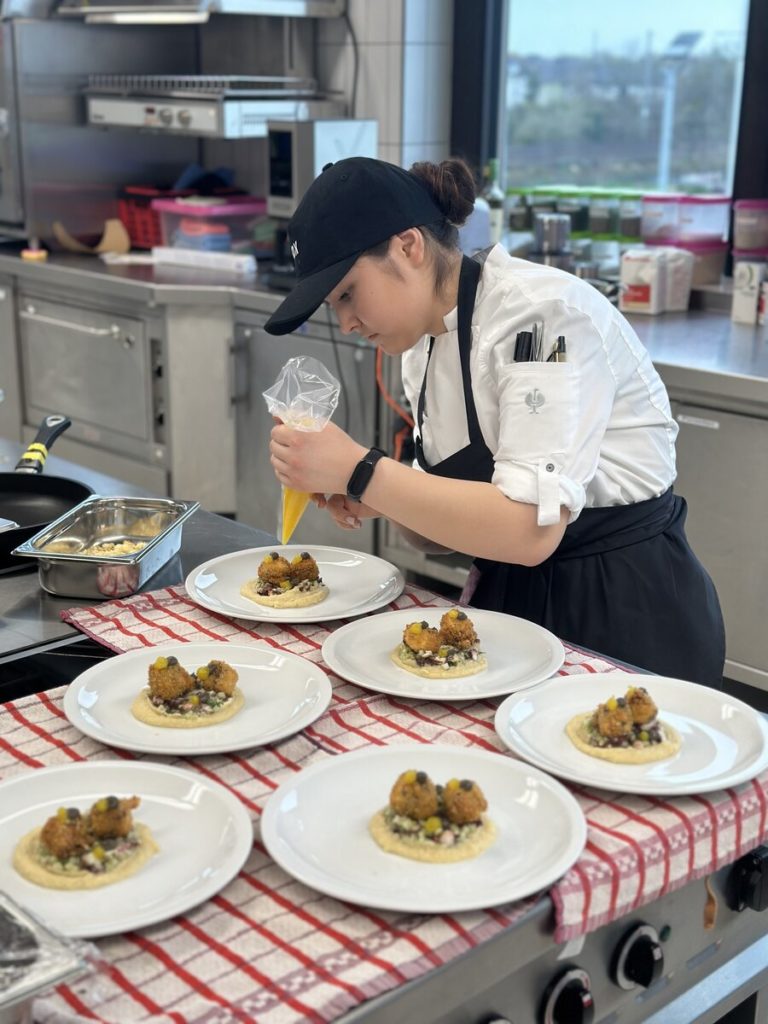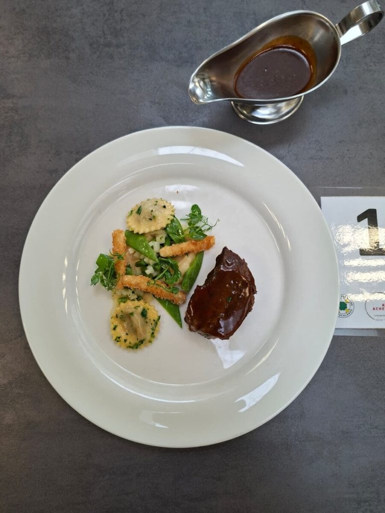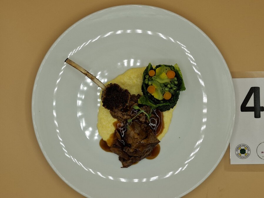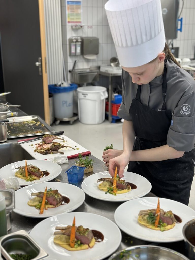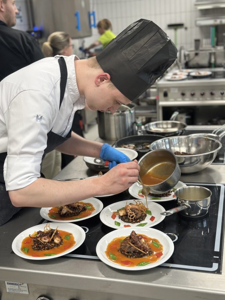 Der Startschuss fiel am 13. März im Albrecht-Dürer-Berufskolleg in Düsseldorf. Für Begeisterung sorgten nicht nur die moderne Schulküche und die neonpinkfarbenen Kochutensilien, sondern auch der herausfordernde Warenkorb: Für die Vorspeise des Drei-Gang-Menüs waren Pulpo und schwarzer Knoblauch gesetzt, im Hauptgang mussten Lammkarree und -schulter verarbeitet werden, für das Dessert waren Birne und Mascarpone vorgeschrieben. Mehr als 20 Gäste zeigten sich begeistert von der Leistung der jungen Köch:innen – darunter die Düsseldorfer Bürgermeisterin Carla Gerlach sowie Schulleiter Ingo Schäfer. Am Ende entschied die Jury um Vorsitzenden Michael Schneider und Observer Ulrich Schäfermeyer, wer ein Ticket für das Finale löste: Maike Hohndorf vom Dorint Hotel Frankfurt/Oberursel und Shakhrizoda Bakhodirova vom Landhotel Voshövel in Schermbeck zeigten das beste kulinarische Gespür und setzten sich gegen ihre sechs Mitstreitenden durch. Neben der Menügestaltung, der Arbeitsweise in der Küche sowie der Präsentation und dem Geschmack floss auch der Arbeitsablaufplan in die Gesamtbewertung ein, mit dem sich die Azubis im Vorfeld beworben hatten.