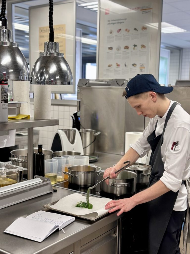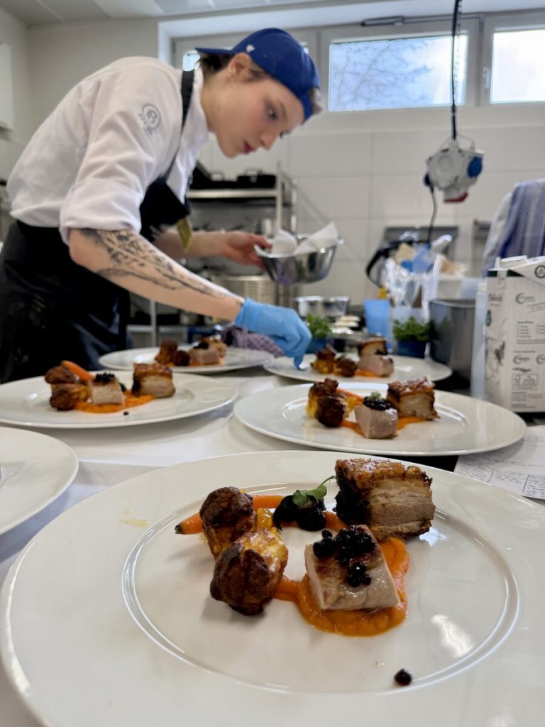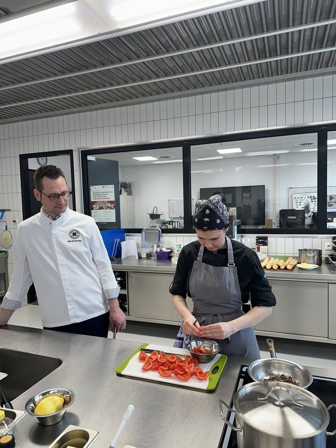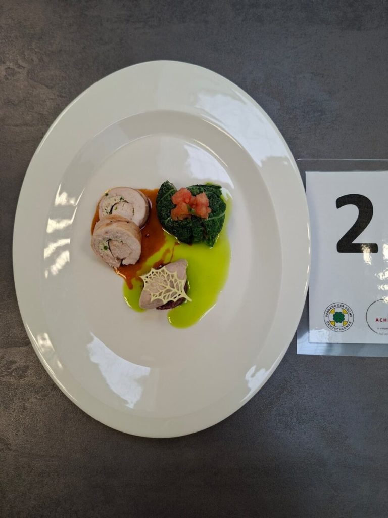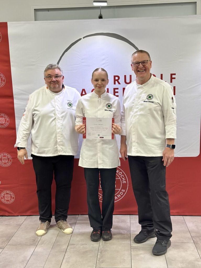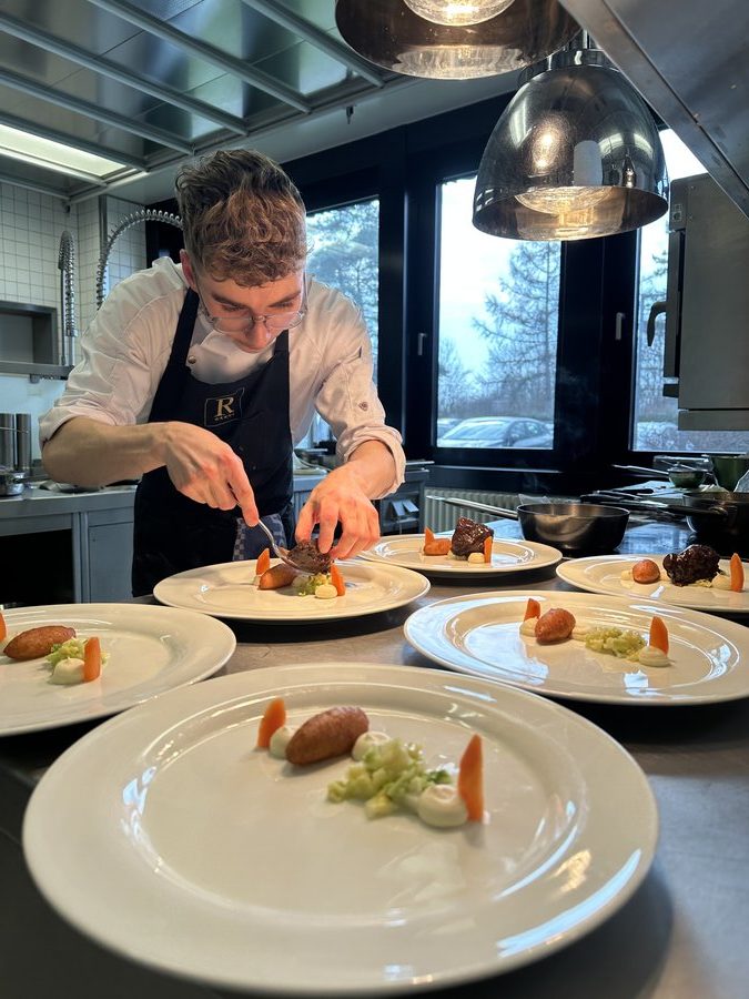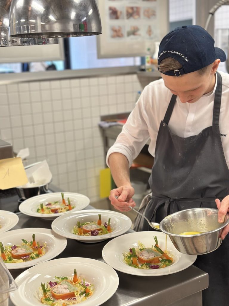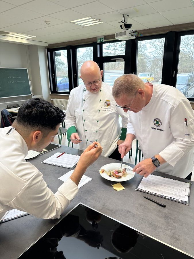 Am 10. April machte der Wettbewerb Station im Berufsschulzentrum am Westerberg in Osnabrück. Auch hier stellten sich acht Nachwuchsköch:innen der Herausforderung und einem anspruchsvollen Warenkorb. Für die Vorspeise waren Goldforelle, Misopaste und Shiitake-Pilze vorgegeben. Im Hauptgang mussten Schweinefilet sowie frischer Schweinebauch mit Schwarte und dreierlei Karotten verarbeitet werden. Den süßen Abschluss bildeten Äpfel und Quark. Unter den rund 30 Gästen befanden sich der Schulleiter Ulf Zumbrägel sowie die Oberbürgermeisterin der Stadt Osnabrück Katharina Pötter, die die Leistungen der Teilnehmenden vor Ort verfolgten. Von Rotwein-Butter-Eis bis geräuchertem Forellenfilet: Die Leihgeräte der Sponsoren Frxsh und Heinzelmann ermöglichten es den Teilnehmenden in allen Halbfinals, ihrer Kreativität freien Lauf zu lassen und sorgten so für geschmackliche Highlights auf den Tellern. Für die passende Weinbegleitung zum Menü sorgte eine Auswahl von der Weinkellerei Höchst. In Osnabrück überzeugten am Ende Isabelle Hatesuer vom Gasthaus Müller in Göxe sowie Svea Kropp vom The Fontenay in Hamburg die Jury und vervollständigen so die Runde der sechs Finalist:innen.