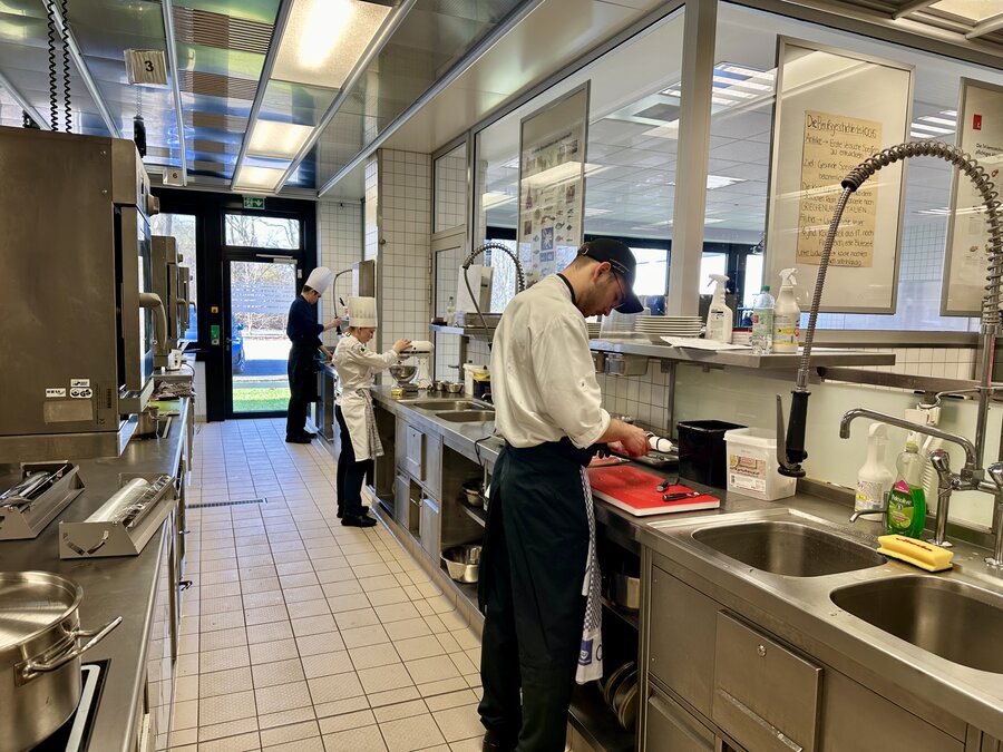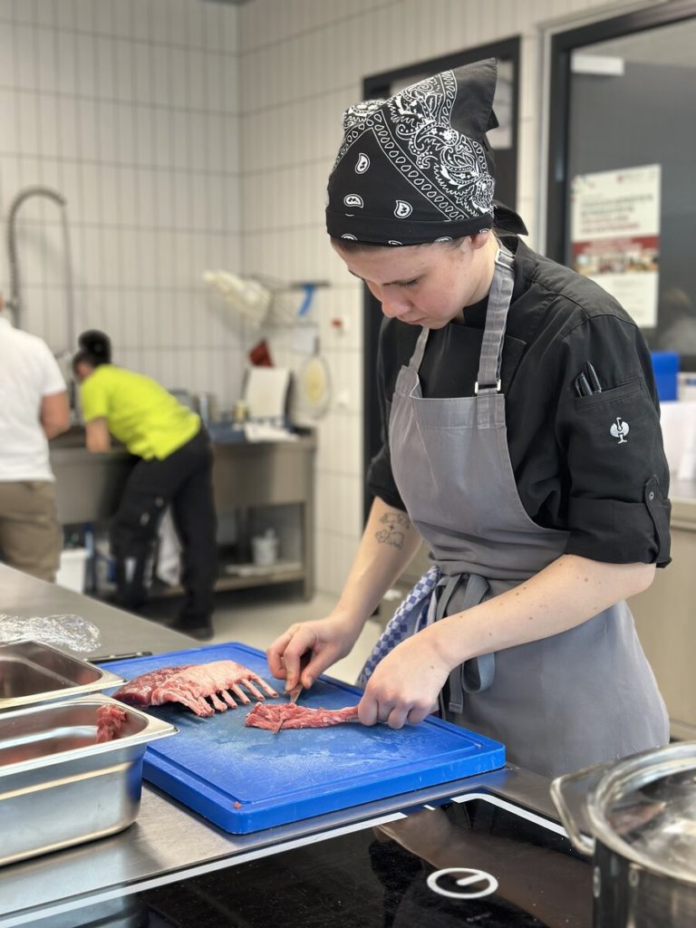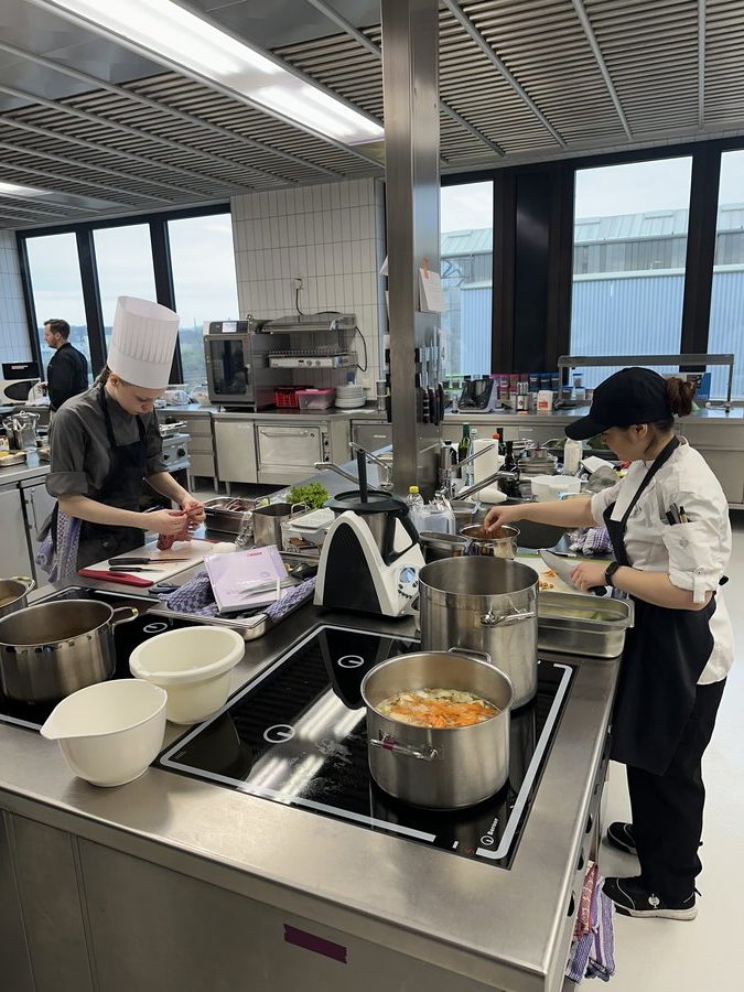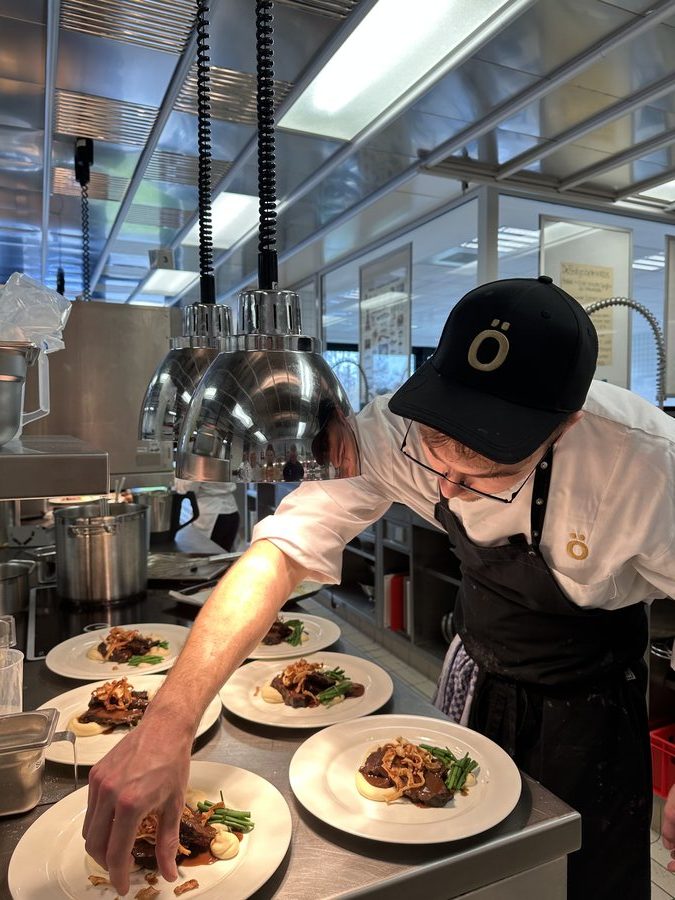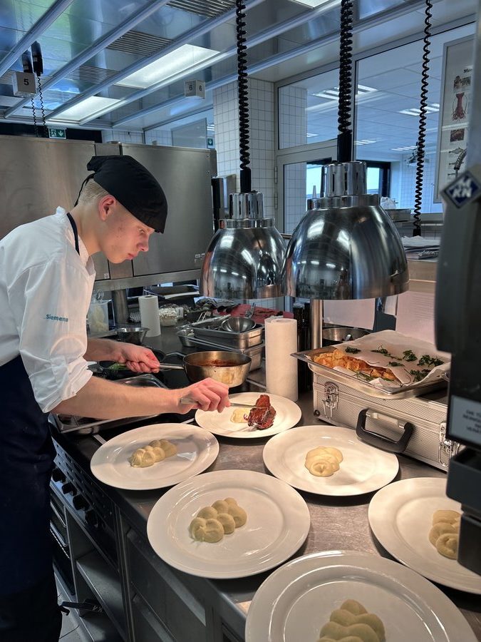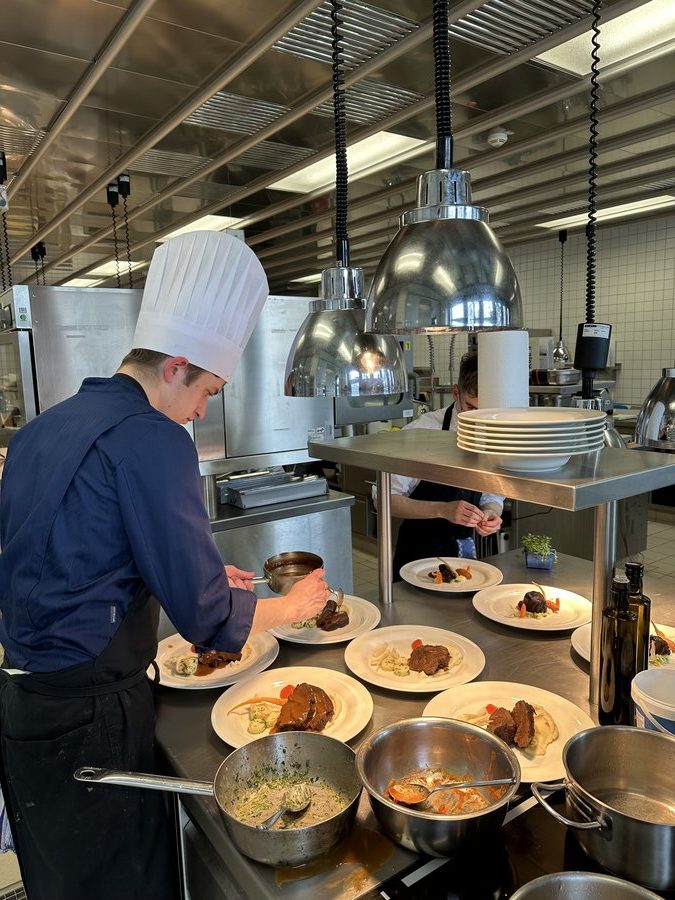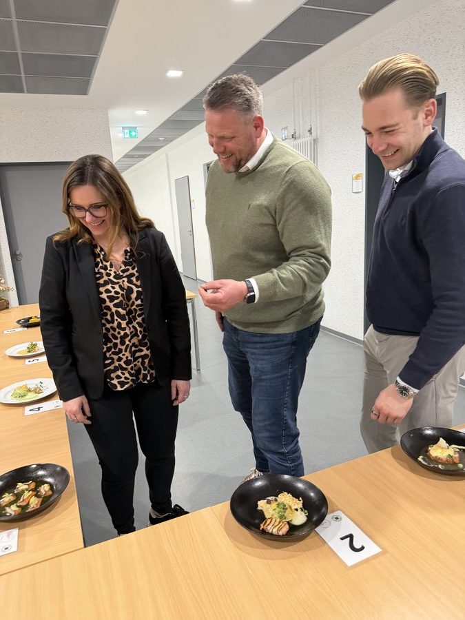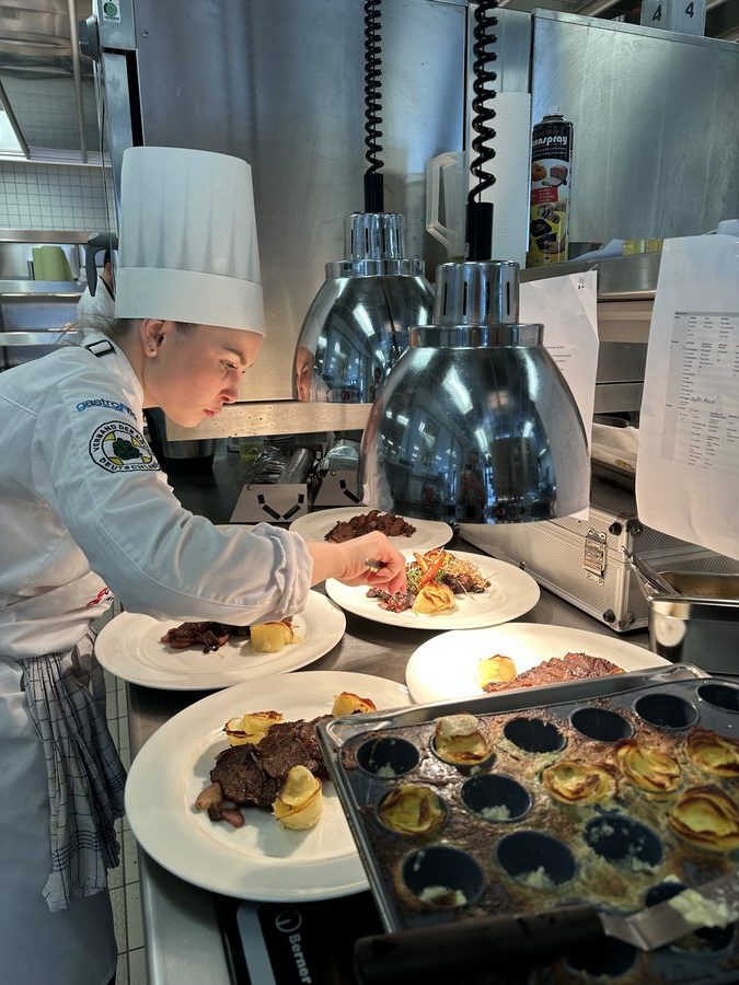 Am 10. April machte der Wettbewerb Station im Berufsschulzentrum am Westerberg in Osnabrück. Auch hier stellten sich acht Nachwuchsköch:innen der Herausforderung und einem anspruchsvollen Warenkorb. Für die Vorspeise waren Goldforelle, Misopaste und Shiitake-Pilze vorgegeben. Im Hauptgang mussten Schweinefilet sowie frischer Schweinebauch mit Schwarte und dreierlei Karotten verarbeitet werden. Den süßen Abschluss bildeten Äpfel und Quark. Unter den rund 30 Gästen befanden sich der Schulleiter Ulf Zumbrägel sowie die Oberbürgermeisterin der Stadt Osnabrück Katharina Pötter, die die Leistungen der Teilnehmenden vor Ort verfolgten. Von Rotwein-Butter-Eis bis geräuchertem Forellenfilet: Die Leihgeräte der Sponsoren Frxsh und Heinzelmann ermöglichten es den Teilnehmenden in allen Halbfinals, ihrer Kreativität freien Lauf zu lassen und sorgten so für geschmackliche Highlights auf den Tellern. Für die passende Weinbegleitung zum Menü sorgte eine Auswahl von der Weinkellerei Höchst. In Osnabrück überzeugten am Ende Isabelle Hatesuer vom Gasthaus Müller in Göxe sowie Svea Kropp vom The Fontenay in Hamburg die Jury und vervollständigen so die Runde der sechs Finalist:innen.