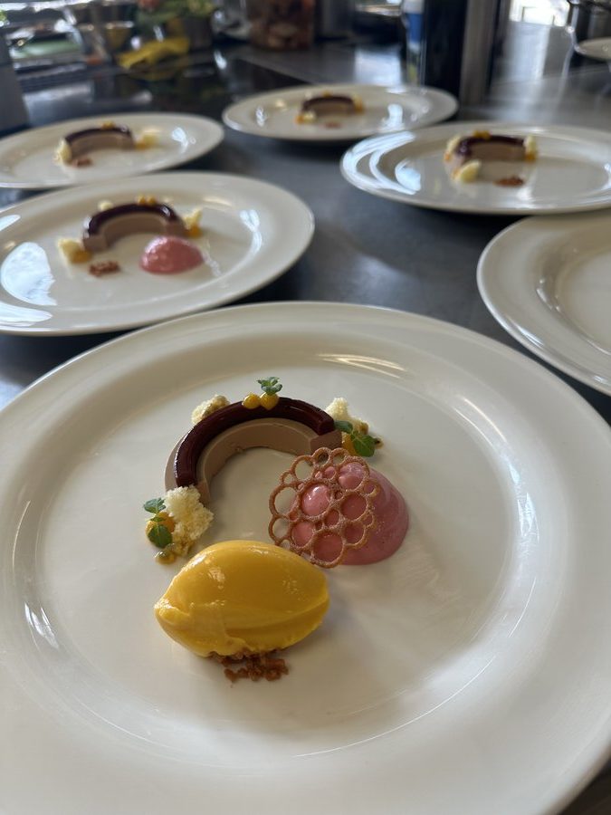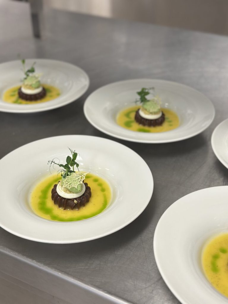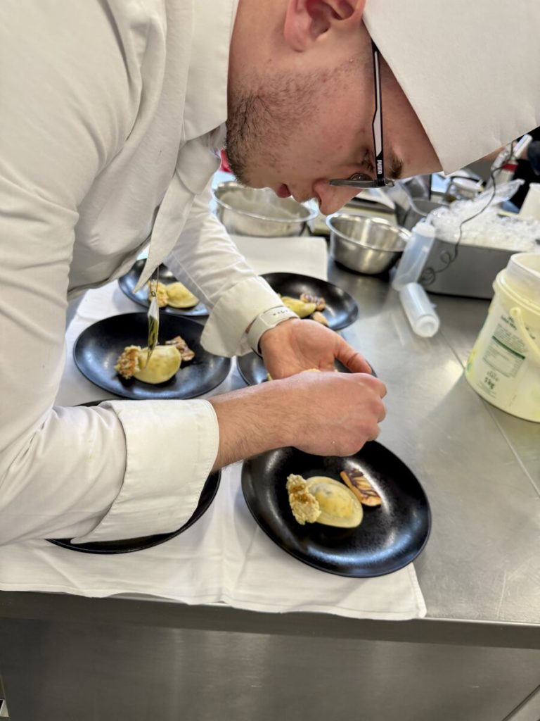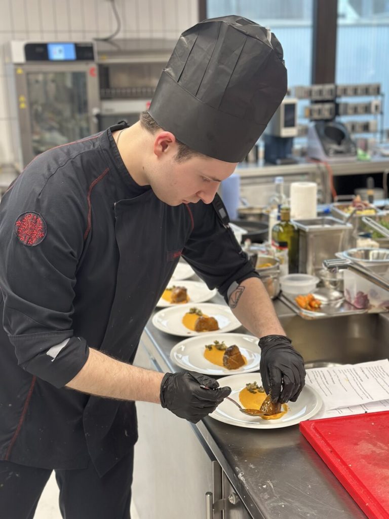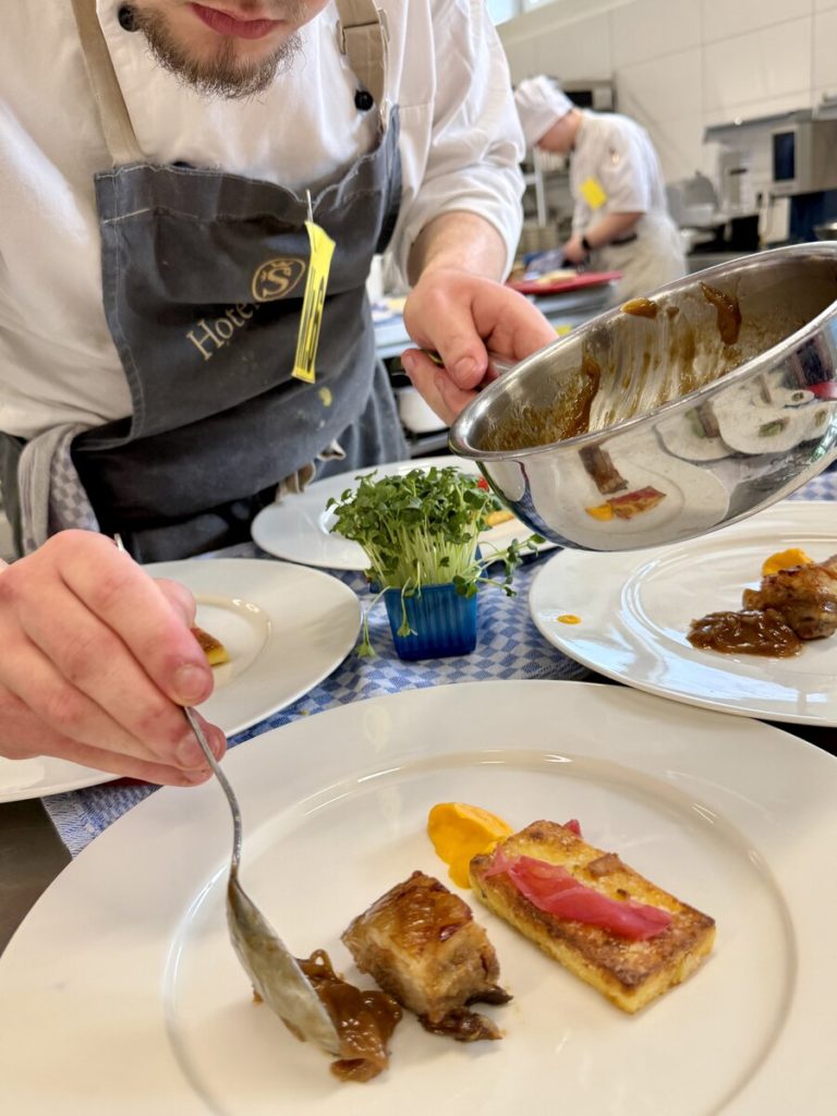 Acht Tage nach Düsseldorf ging es in der Eduard-Stieler-Schule in Fulda spannend weiter, als acht junge Kochtalente um zwei weitere begehrte Finalplätze kämpften. Sie mussten aus einem Warenkorb mit Kaninchen und grünem Pfeffer, Ochsenbäckchen und Pastinake sowie Passionsfrucht und Nougat jeweils ein Drei-Gang-Menü für sechs Personen kreieren. Die frischen Produkte stellte in allen Halbfinals Transgourmet zur Verfügung. Der Premiumsponsor unterstützt den Wettbewerb zudem mit Gutscheinen zum Trainieren: 150 Euro für die Halbfinals, 300 Euro für die Finalist:innen. Das Training zahlte sich aus: Die rund 30 Gäste, darunter Schulleiterin Isabel Herbert, lobten die Menüs der Nachwuchstalente in höchsten Tönen. Den Sieg und damit die Finaltickets sicherten sich zwei Azubis aus Baden-Württemberg: Dennis Weinert von der Traube Tonbach in Baiersbronn sowie Leonie Maier vom 1950 Bio-Fine-Dining-Restaurant in Hayingen.