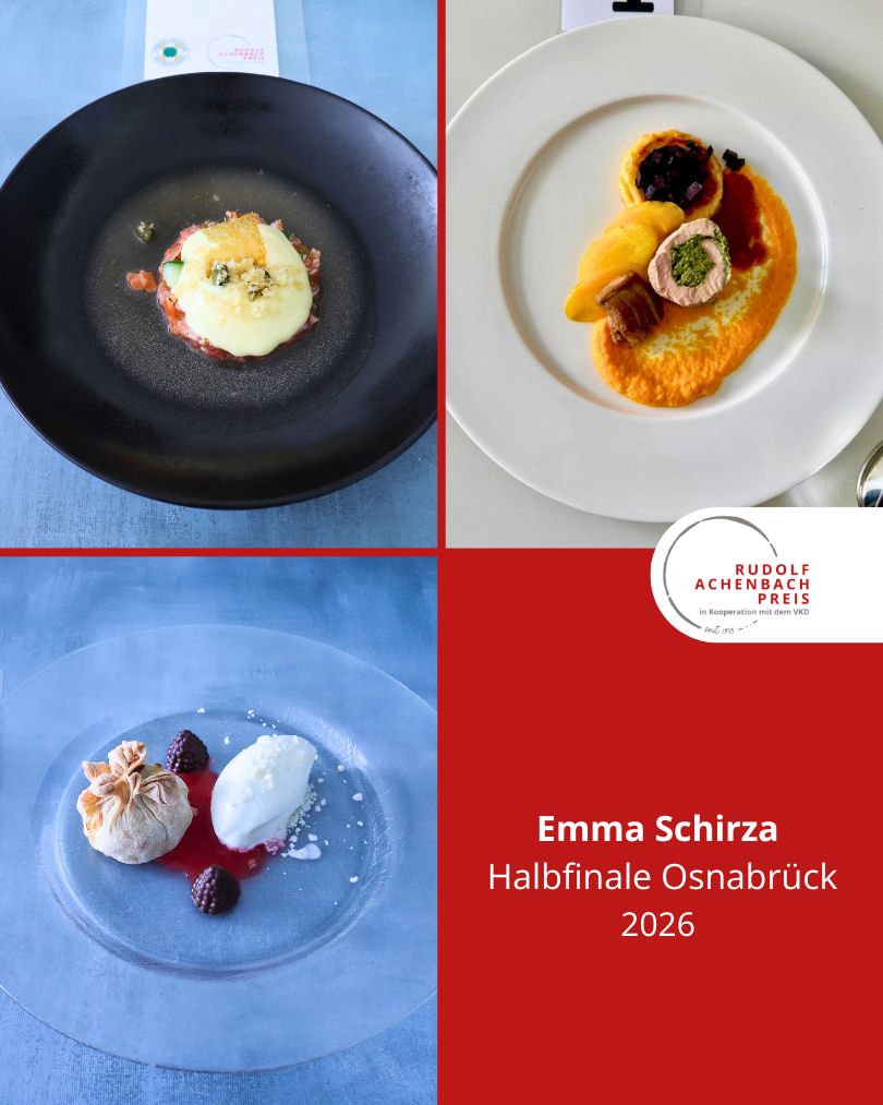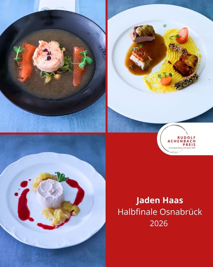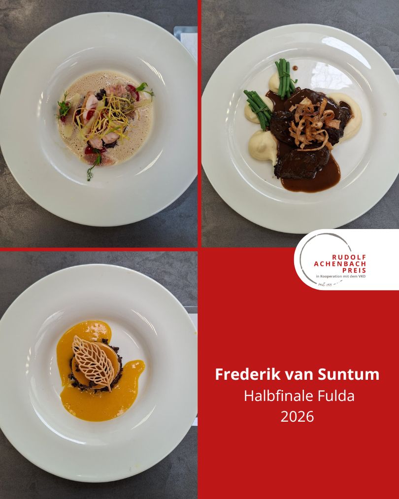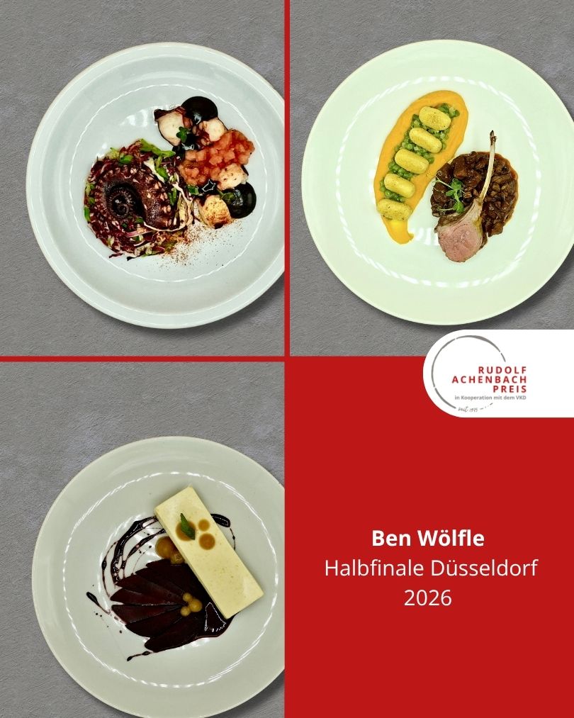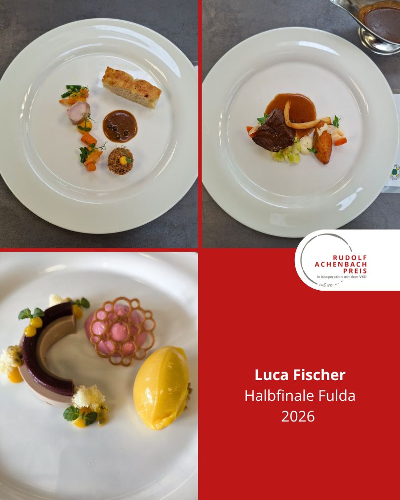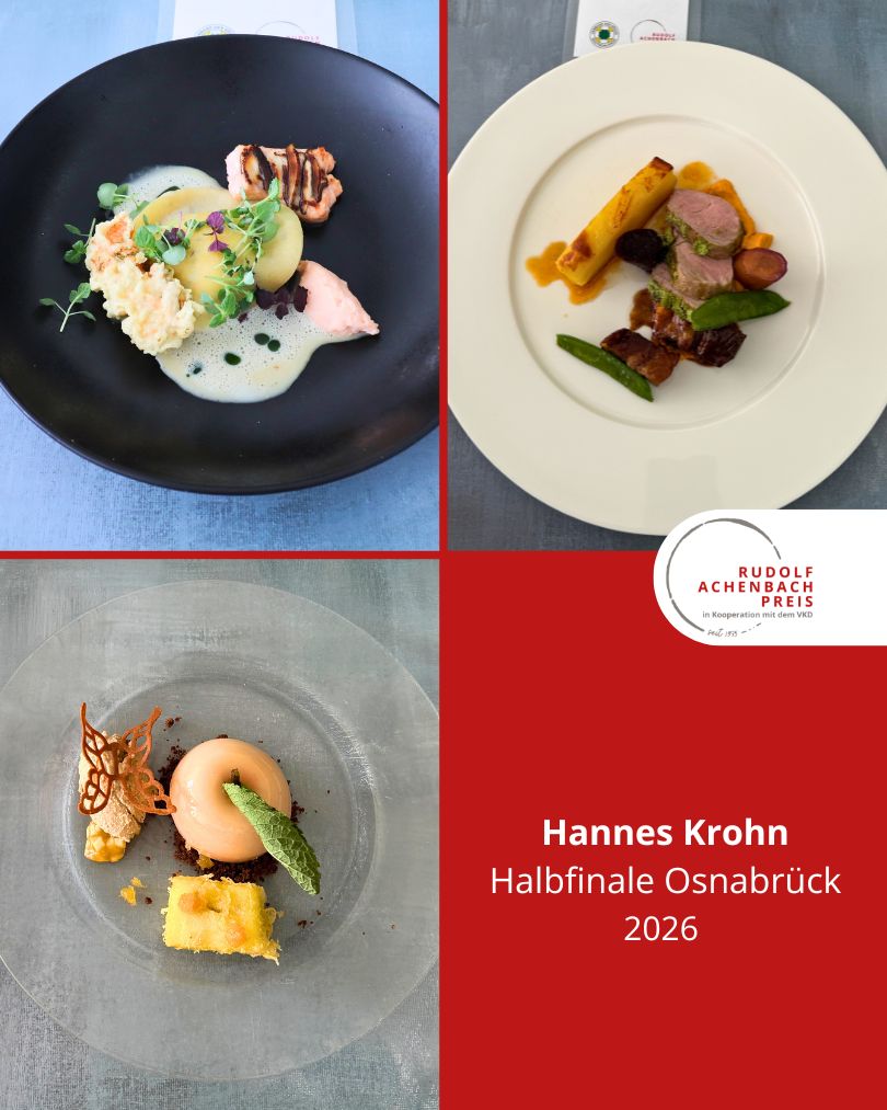 24 angehende Köch:innen, drei Halbfinals, ein Ziel: der Einzug ins Finale des Rudolf Achenbach Preis 2026. Im vergangenen Jahr hatten der Verband der Köche Deutschlands e. V. (VKD) und die Achenbach Delikatessen-Manufaktur den traditionsreichen Wettbewerb zum 50-jährigen Jubiläum modernisiert – ein Konzept, das in diesem Jahr erfolgreich fortgeführt wurde. Über 70 Kochauszubildende aus dem zweiten und dritten Lehrjahr hatten sich bundesweit beworben – aus Sternerestaurants und großen Hotels, Betriebskantinen, Cateringunternehmen und kleinen Landgasthöfen. In einer anonymen Auswertung sichtete die Jury die eingereichten Arbeitsablaufpläne und wählte 24 Nachwuchstalente für die praktischen Halbfinals aus. An drei Standorten traten je acht Wettstreiter:innen gegeneinander an, um sich einen Platz im Finale zu sichern. Die Aufgabe: die Planung, Zubereitung und das Anrichten eines Drei-Gang-Menüs für jeweils sechs Personen. Jeder erhielt zwei mögliche Warenkörbe mit Pflicht- und Wahlkomponenten, zu denen zuvor ein Menü eingereicht worden war. Erst am Wettkampftag wurde bekannt, welcher der beiden Körbe tatsächlich zum Einsatz kam. Auf insgesamt 432 Tellern bewiesen die Auszubildenden Können, Kreativität und Nervenstärke.