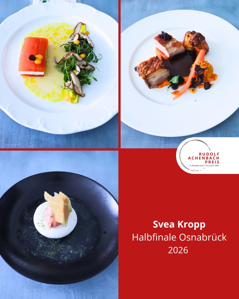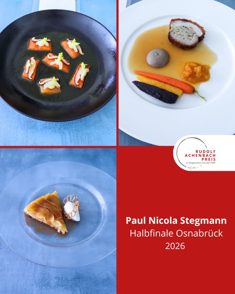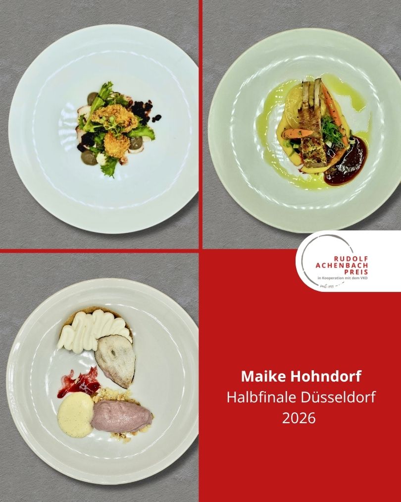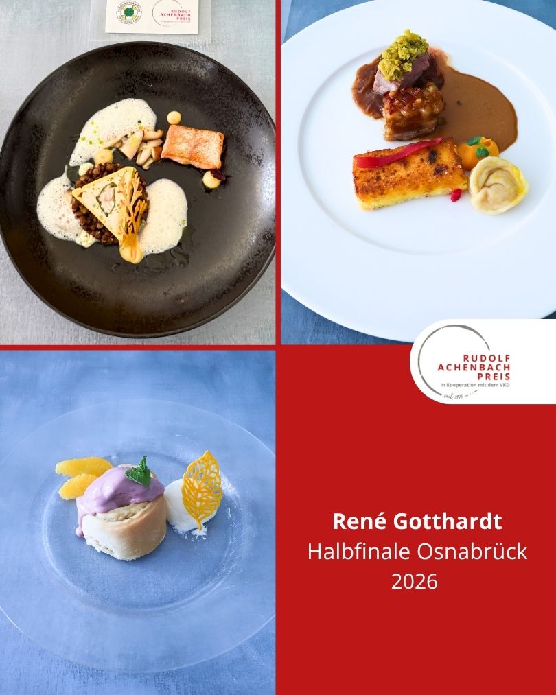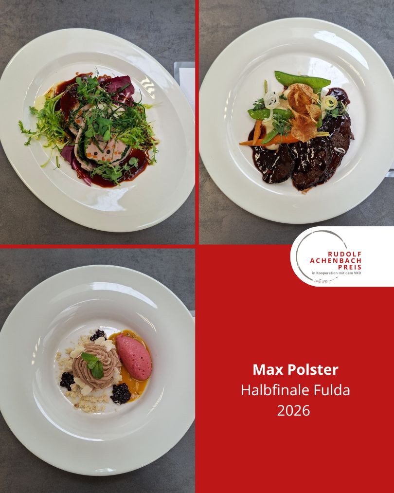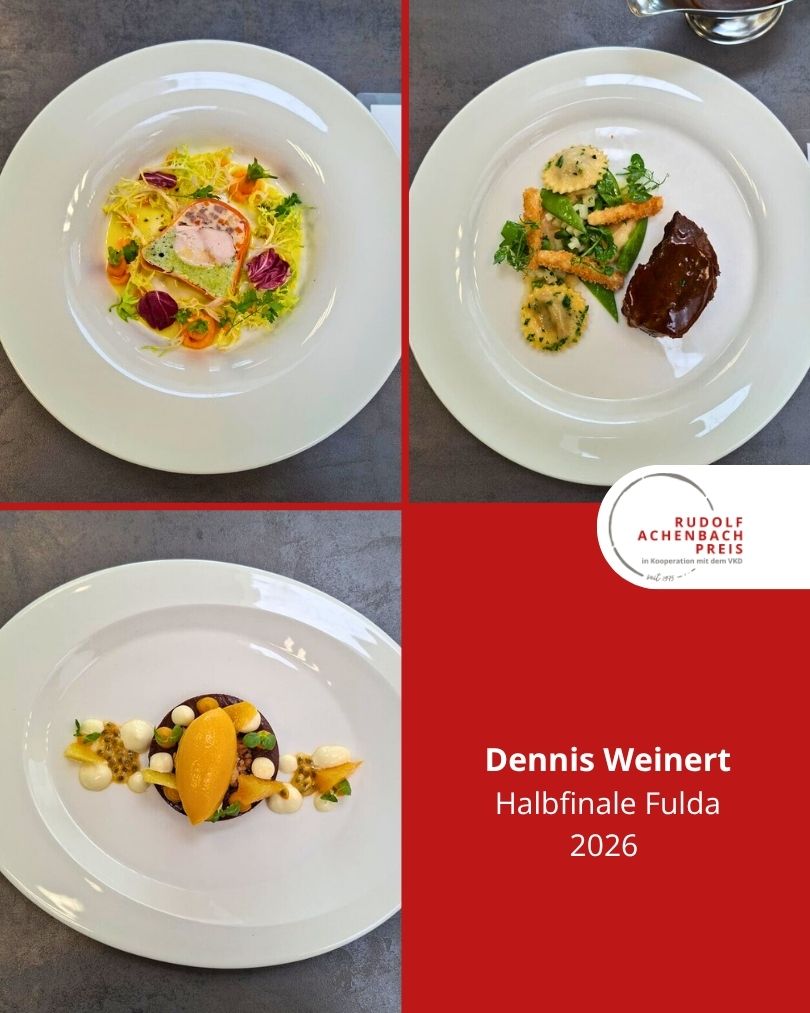 24 angehende Köch:innen, drei Halbfinals, ein Ziel: der Einzug ins Finale des Rudolf Achenbach Preis 2026. Im vergangenen Jahr hatten der Verband der Köche Deutschlands e. V. (VKD) und die Achenbach Delikatessen-Manufaktur den traditionsreichen Wettbewerb zum 50-jährigen Jubiläum modernisiert – ein Konzept, das in diesem Jahr erfolgreich fortgeführt wurde. Über 70 Kochauszubildende aus dem zweiten und dritten Lehrjahr hatten sich bundesweit beworben – aus Sternerestaurants und großen Hotels, Betriebskantinen, Cateringunternehmen und kleinen Landgasthöfen. In einer anonymen Auswertung sichtete die Jury die eingereichten Arbeitsablaufpläne und wählte 24 Nachwuchstalente für die praktischen Halbfinals aus. An drei Standorten traten je acht Wettstreiter:innen gegeneinander an, um sich einen Platz im Finale zu sichern. Die Aufgabe: die Planung, Zubereitung und das Anrichten eines Drei-Gang-Menüs für jeweils sechs Personen. Jeder erhielt zwei mögliche Warenkörbe mit Pflicht- und Wahlkomponenten, zu denen zuvor ein Menü eingereicht worden war. Erst am Wettkampftag wurde bekannt, welcher der beiden Körbe tatsächlich zum Einsatz kam. Auf insgesamt 432 Tellern bewiesen die Auszubildenden Können, Kreativität und Nervenstärke.