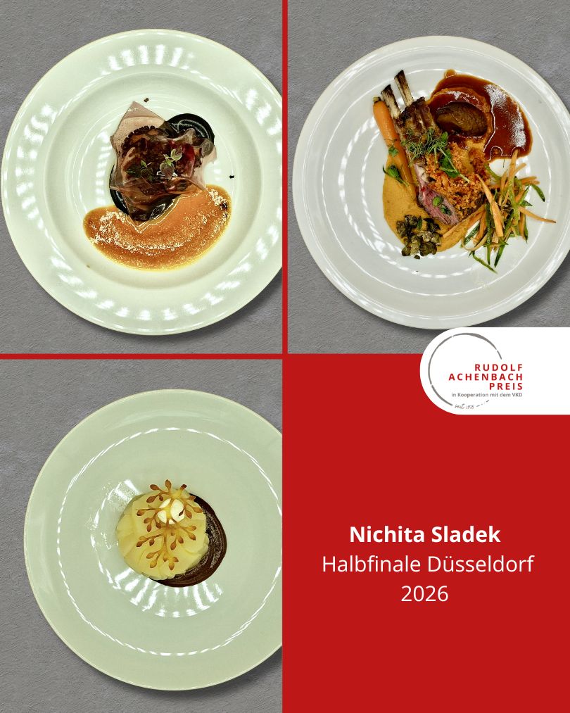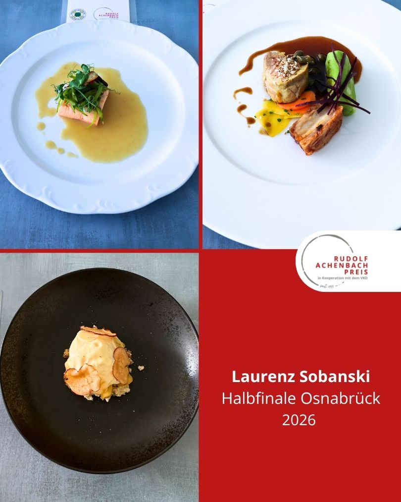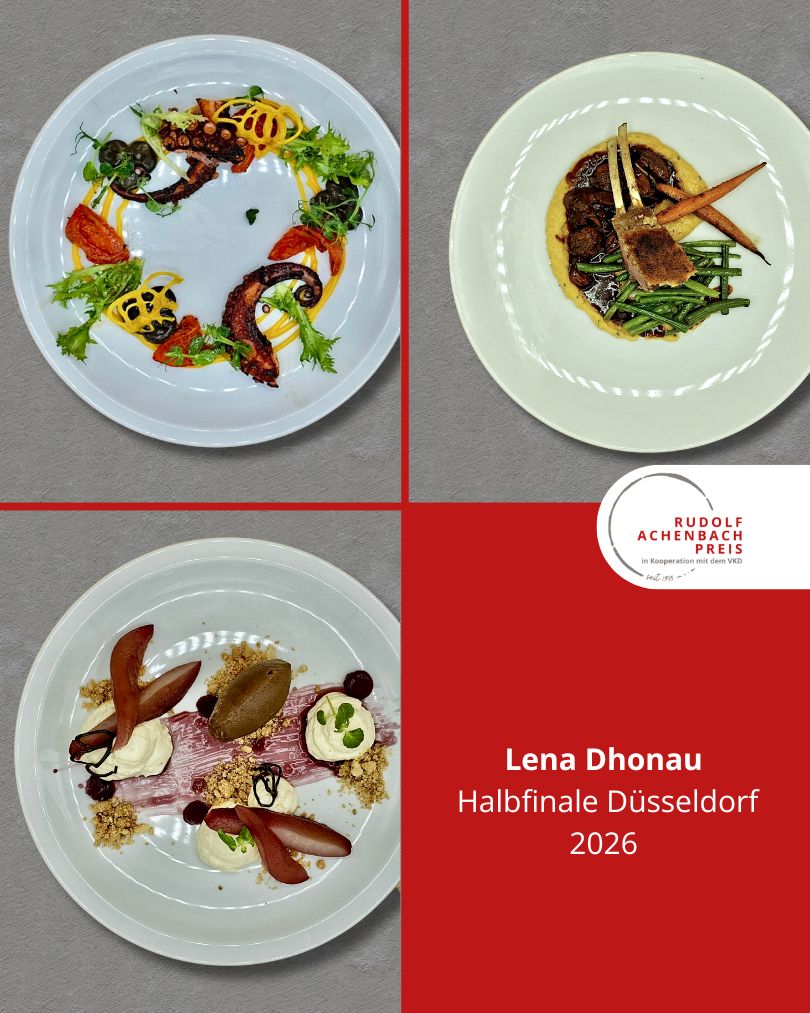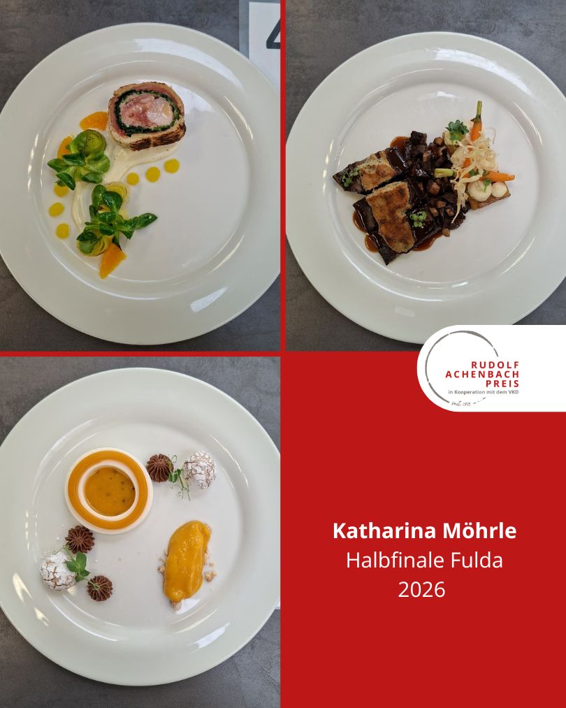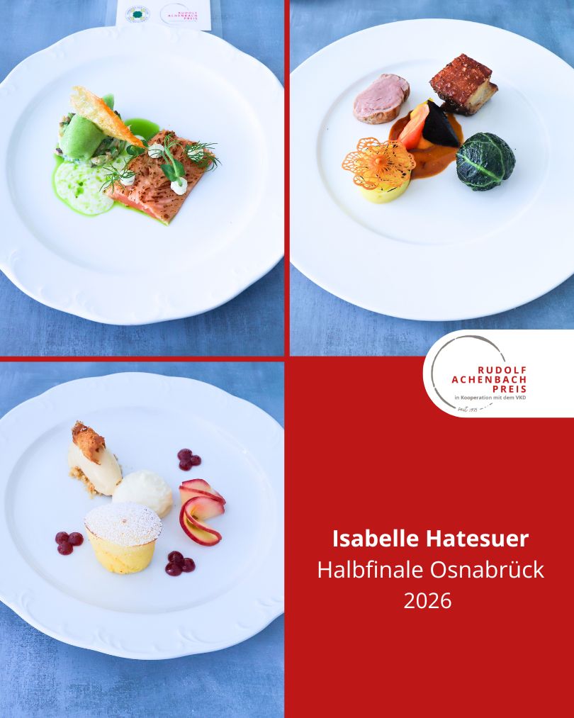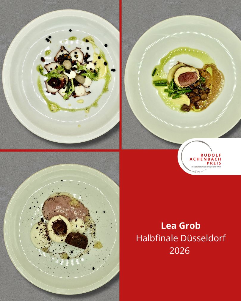 24 angehende Köch:innen, drei Halbfinals, ein Ziel: der Einzug ins Finale des Rudolf Achenbach Preis 2026. Im vergangenen Jahr hatten der Verband der Köche Deutschlands e. V. (VKD) und die Achenbach Delikatessen-Manufaktur den traditionsreichen Wettbewerb zum 50-jährigen Jubiläum modernisiert – ein Konzept, das in diesem Jahr erfolgreich fortgeführt wurde. Über 70 Kochauszubildende aus dem zweiten und dritten Lehrjahr hatten sich bundesweit beworben – aus Sternerestaurants und großen Hotels, Betriebskantinen, Cateringunternehmen und kleinen Landgasthöfen. In einer anonymen Auswertung sichtete die Jury die eingereichten Arbeitsablaufpläne und wählte 24 Nachwuchstalente für die praktischen Halbfinals aus. An drei Standorten traten je acht Wettstreiter:innen gegeneinander an, um sich einen Platz im Finale zu sichern. Die Aufgabe: die Planung, Zubereitung und das Anrichten eines Drei-Gang-Menüs für jeweils sechs Personen. Jeder erhielt zwei mögliche Warenkörbe mit Pflicht- und Wahlkomponenten, zu denen zuvor ein Menü eingereicht worden war. Erst am Wettkampftag wurde bekannt, welcher der beiden Körbe tatsächlich zum Einsatz kam. Auf insgesamt 432 Tellern bewiesen die Auszubildenden Können, Kreativität und Nervenstärke.