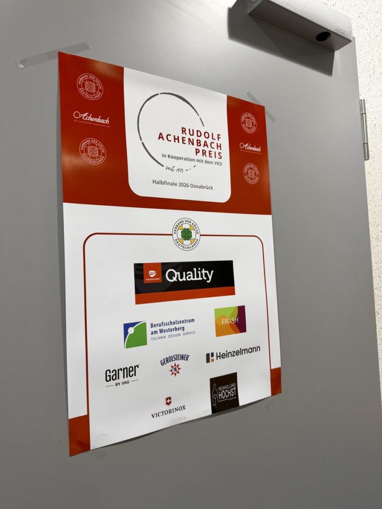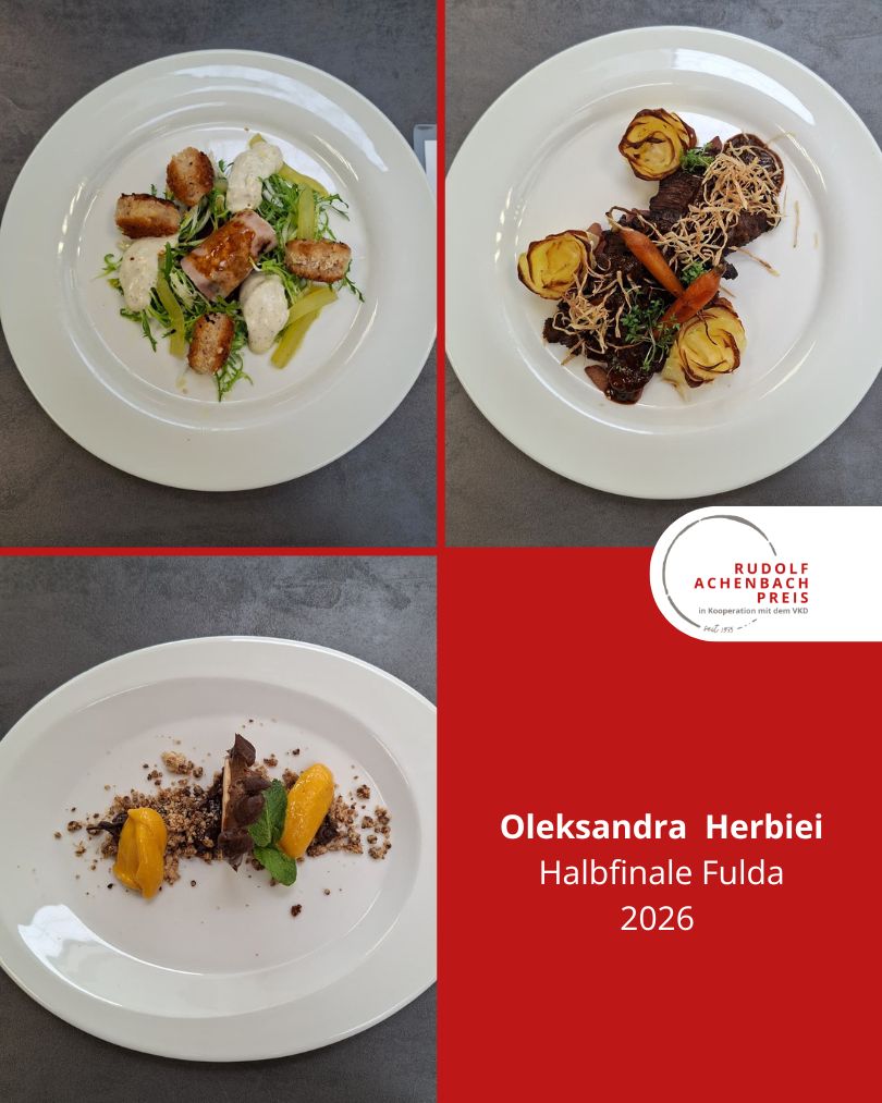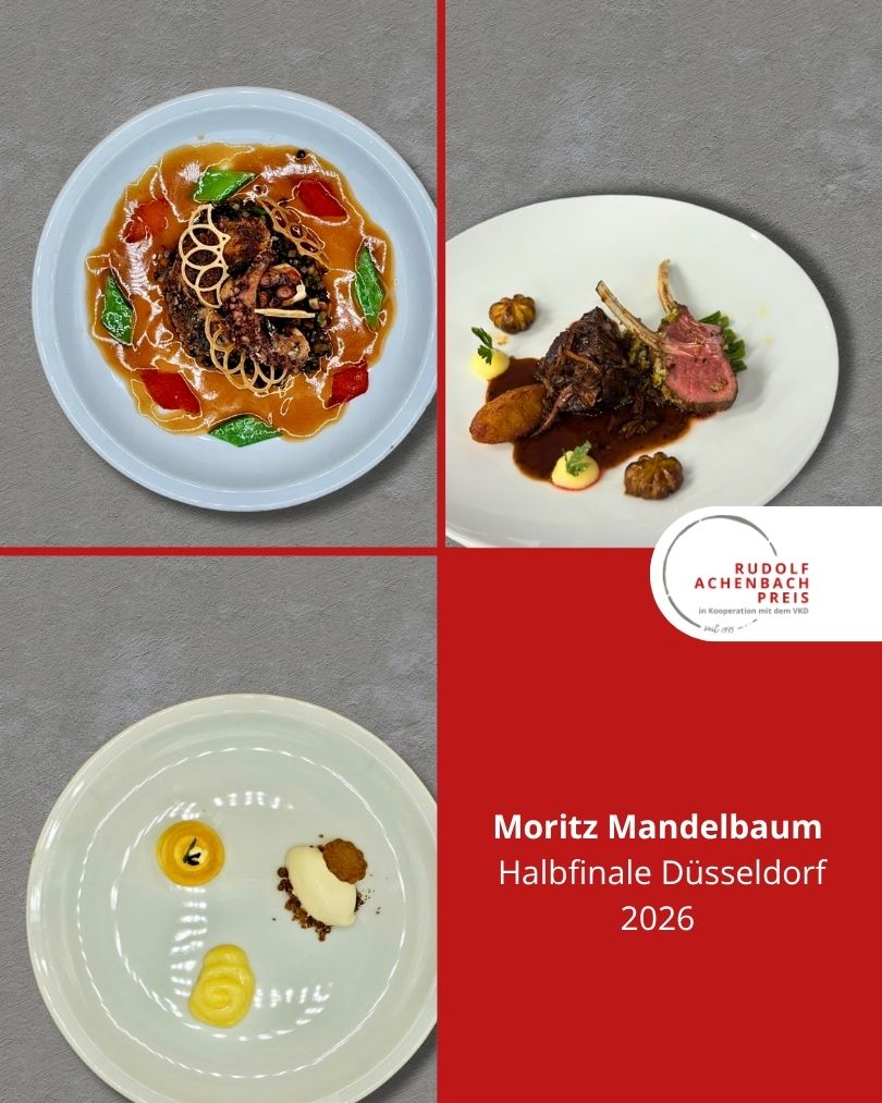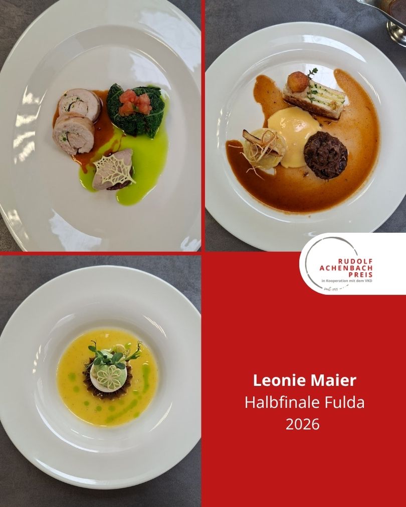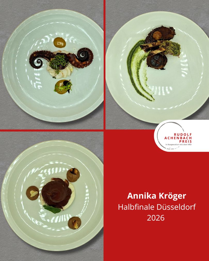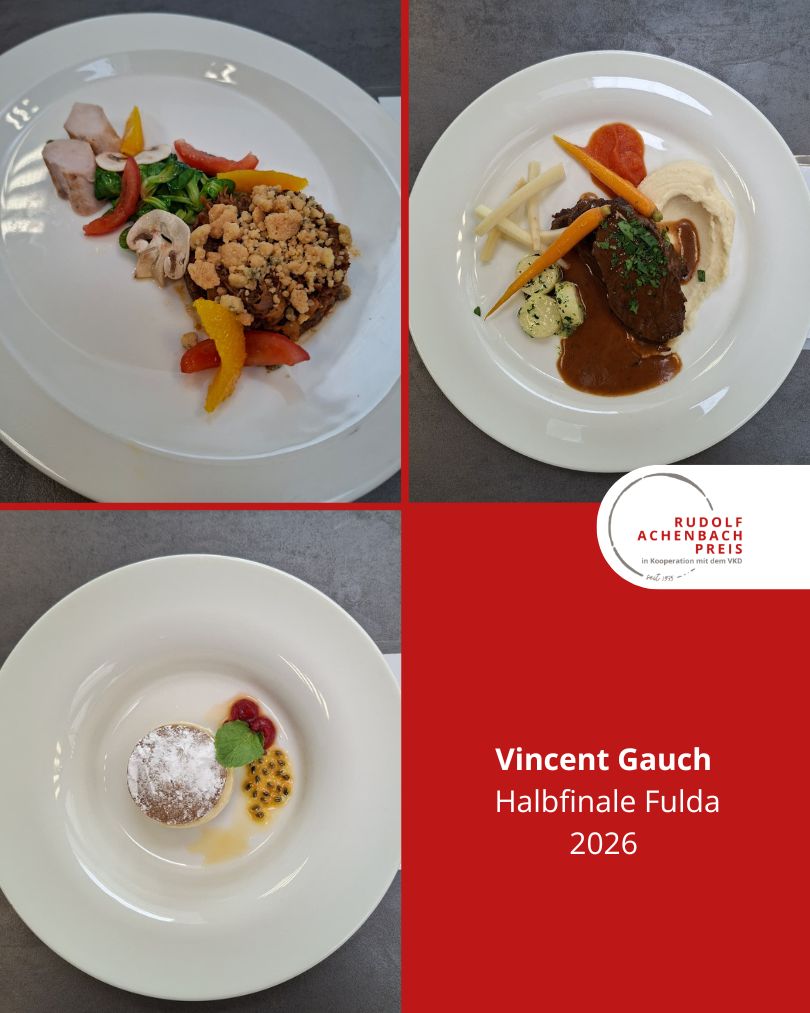 24 angehende Köch:innen, drei Halbfinals, ein Ziel: der Einzug ins Finale des Rudolf Achenbach Preis 2026. Im vergangenen Jahr hatten der Verband der Köche Deutschlands e. V. (VKD) und die Achenbach Delikatessen-Manufaktur den traditionsreichen Wettbewerb zum 50-jährigen Jubiläum modernisiert – ein Konzept, das in diesem Jahr erfolgreich fortgeführt wurde. Über 70 Kochauszubildende aus dem zweiten und dritten Lehrjahr hatten sich bundesweit beworben – aus Sternerestaurants und großen Hotels, Betriebskantinen, Cateringunternehmen und kleinen Landgasthöfen. In einer anonymen Auswertung sichtete die Jury die eingereichten Arbeitsablaufpläne und wählte 24 Nachwuchstalente für die praktischen Halbfinals aus. An drei Standorten traten je acht Wettstreiter:innen gegeneinander an, um sich einen Platz im Finale zu sichern. Die Aufgabe: die Planung, Zubereitung und das Anrichten eines Drei-Gang-Menüs für jeweils sechs Personen. Jeder erhielt zwei mögliche Warenkörbe mit Pflicht- und Wahlkomponenten, zu denen zuvor ein Menü eingereicht worden war. Erst am Wettkampftag wurde bekannt, welcher der beiden Körbe tatsächlich zum Einsatz kam. Auf insgesamt 432 Tellern bewiesen die Auszubildenden Können, Kreativität und Nervenstärke.