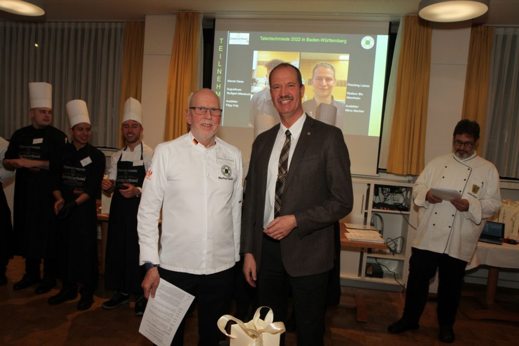 Die Küchenparty am Samstagabend war das Highlight der Veranstaltung. Manfred Fischer, zweiter Vorsitzender des Landesverbands, begrüßte zahlreiche Gäste, Sponsoren und Kolleg:innen und sprach seinen Dank aus für die Unterstützung der Talentschmiede. Ohne den Support wäre es dem Orga-Team um Stefan Jung, Jugendsprecher des LV Baden-Württemberg, nicht möglich, eine Veranstaltung dieser Qualität für die interessierten Teilnehmenden auszurichten. Bei der Küchenparty probierten die Gäste das salzige und süße Fingerfood, die jungen Köchinnen und Köche standen Rede und Antwort über Herstellungsverfahren, Geschmackskombinationen und Arbeitsweisen. Sowohl die kulinarischen Ergebnisse als auch die Begegnungen zwischen Gästen und Azubis begeisterten alle Anwesenden.