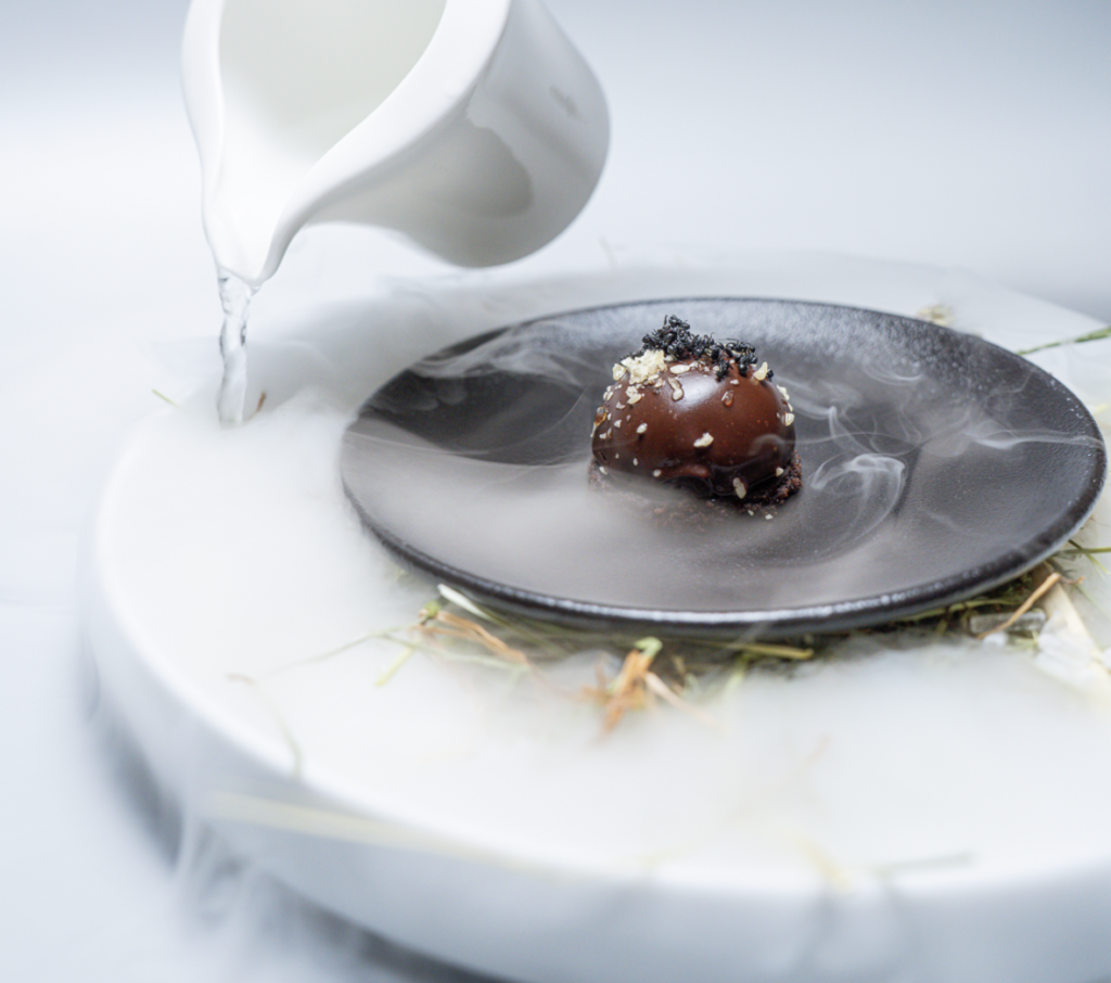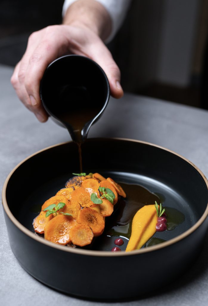 Für seinen Tasty Teller hat Enrico Münker den Feldhasen sanft geschmort und mit Waldaromen verfeinert. Dazu gibt es geräucherte Kartoffel, getrocknete Pastinake und ein vergorenes Pflaumeneis im frittierten Schwarzkohlblatt, überzogen mit einer Algenmayonnaise. Der Saibling und die Feige wurden vorher und nachher gereicht. „Bei mir wird nichts weggeschmissen“, sagt der passionierte Koch. „Nachhaltigkeit und Saisonalität werden in meiner Küche großgeschrieben, damit erhalten die Lebensmittel gewissermaßen ein zweites Leben.“ Jung und neugierig, aber auch zurückhaltend und höflich: So beschreibt sich Enrico Münker selbst und hat es sich zur Aufgabe gemacht, auch künftig „anspruchsvolle Gäste mit außergewöhnlichen Gerichten zu verzaubern“.