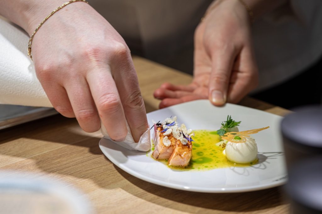 Der eigentliche „Star“ aber war der Lachs aus den Westfjorden Islands der Marke Ursprung. Für die kreative Verwandlung hatten die Teammitglieder ihn gebeizt, von außen kurz heiß geflämmt, lackiert, ummantelt und in dünnen Tranchen aufgeschnitten. Angerichtet auf einem Ingwer-Zitronengras-Sud mit unterschiedlichen Zwiebelgewächsen – gebrannten Lauchherzen, Schnittlauch-Emulsion und eingelegten Perlzwiebeln –, wurde daraus ein „Signature Dish“ für dieses Event. Auf der Berliner Bühne war die Mannschaft in bester Gesellschaft, im Laufe des Tages zeigten renommierte Köche wie Frank Rosin (Green Rosin), Sebastian Frank (Restaurant Horváth) und Gal Ben Moshe (Prism) ihr Können und teilten ihr Fachwissen zu Themen wie Planetary Health Diet oder Modern Levantine Cuisine.