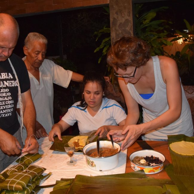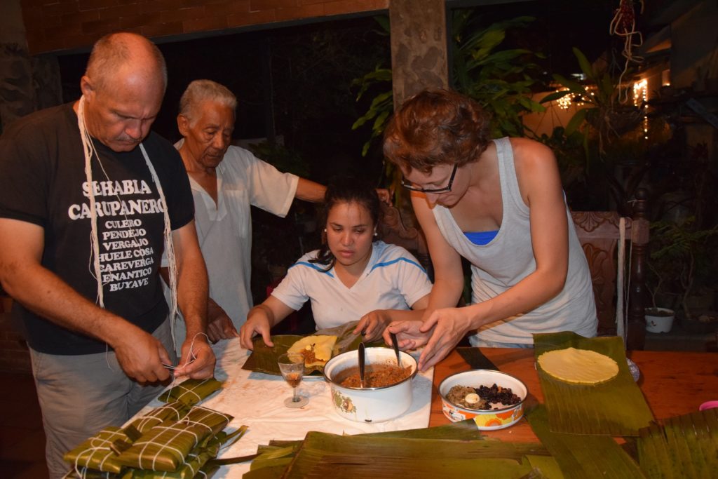 Auch zu den Feiertagen gab es traditionelle Gerichte nur in abgewandelten Versionen. An Weihnachten und Neujahr kocht man traditionell Hallacas. Das ist ebenfalls eine Maismasse, die gefüllt in ein Bananenblatt eingewickelt wird. Die Herstellung wird mit der gesamten Familie zelebriert, und zwischendurch gibt es immer mal Ponche de Crema, eine Art Eierlikör mit Zimt. Ebenfalls probiert haben muss man die Cachapa, einen großen gefüllten Maispfannkuchen, und das Nationalgericht Pabellón criollo.