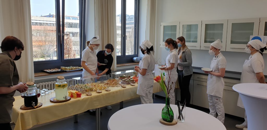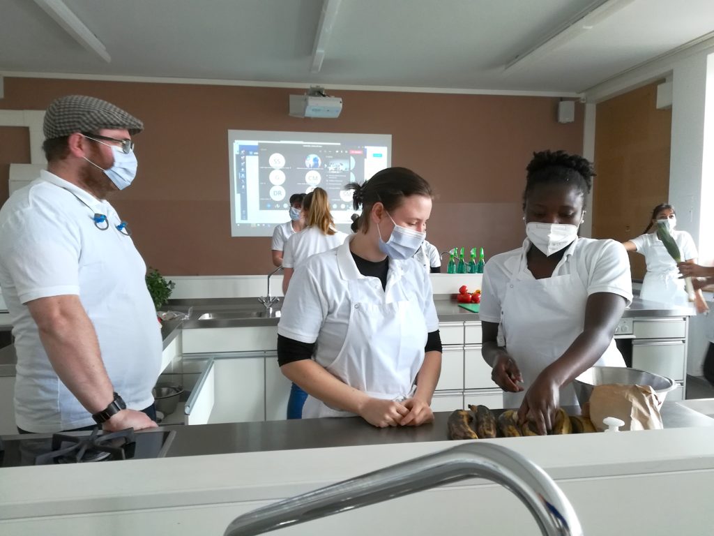 Grenzüberschreitendes Kochen und der Austausch mit anderen Nationen sind für die Würzburger Schule eine Selbstverständlichkeit, unter anderem im Rahmen einer strategischen Schulpartnerschaft von Erasmus+, die aus Mitteln der Europäischen Union finanziert wird. So ist die Fachakademie für Ernährungs- und Versorgungsmanagement seit Herbst 2018 gemeinsam mit zwei beruflichen Schulen in Zentralspanien und Italien in dem internationalen Projekt „Slowfood – living Europe, encouraging the regions“ zum Thema Nachhaltigkeit in der Ernährung aktiv. Die Studierenden beschäftigen sich unter verschiedenen Blickwinkeln mit traditionellen Herstellungsverfahren von Lebensmitteln. Dabei haben sie vor allem den europäischen Kontext im Fokus und beleuchten die Frage, weshalb traditionelle Verfahren die Regionen stärken können. Bereits vier Mal haben sich deutsche Studierende mit Spaniern und Italienern in einem der drei Länder getroffen. Als die realen Treffen in 2020 ausfallen mussten, bot die spanische Schule kurzerhand ein Web-Seminar für alle zum Thema Fingerfood und Slow-Food an.