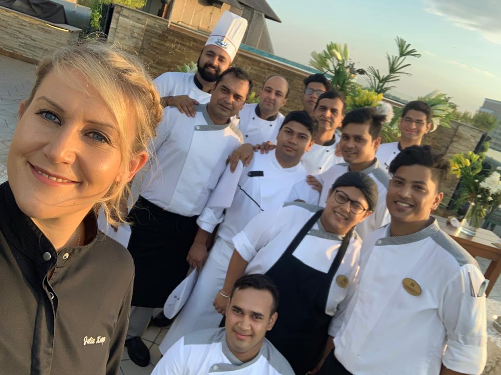 „Namaskar“ – das heißt auf Indisch „willkommen“. Ein magisches Wort, mit dem man in Indien mit gefalteten Händen grüßt. Fünf Städte bereiste Julia in Indien. Neben der Hauptstadt Neu-Delhi machte sie auch Halt in Mumbai, Kalkutta, Bengaluru und Chola. Die Reise nach Indien hatte kulinarisch großen Einfluss auf die junge Köchin, die 2016 zur jüngsten Sterneköchin Deutschlands gekürt wurde. In Indien kochte sie viele Stunden am Stück ohne Pause in exklusiven Hotels mit immer unterschiedlichen Teams. Viel Spaß hat ihr die Arbeit in der Küche gemacht, dafür blieb für Julia wenig Zeit für Sightseeing. Dennoch konnte sie die Gelegenheit finden, auf einen der unzähligen Stadtmärkte zu stöbern und auch das ein oder andere Souvenir zu erstehen. „In Indien konnte ich nicht widerstehen, bei den Gewürzen zuzugreifen. Ich habe eine Gewürzsammlung aus Nelken, Sternanis, Kardamom und Fenchel eingeschweißt und mit nach Hause genommen. Der ganze Raum, in dem die Gewürze gelagert sind, duftet heute noch einfach himmlisch.“, schwärmt Julia.