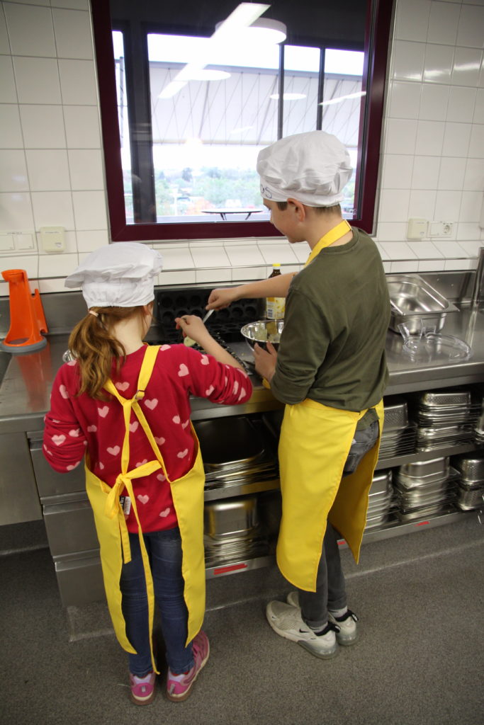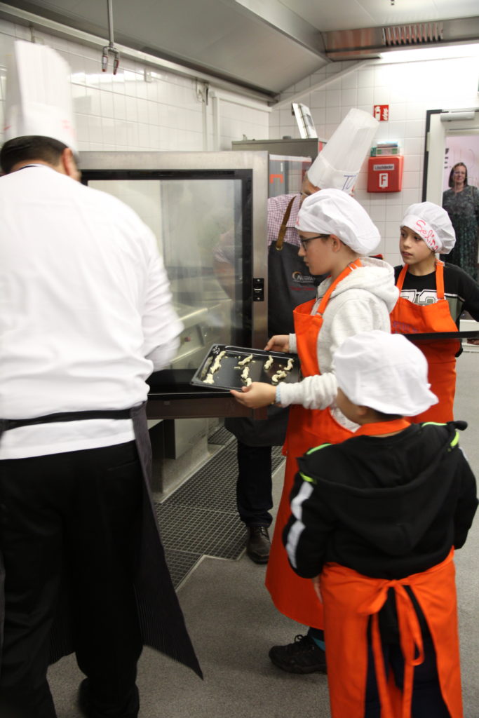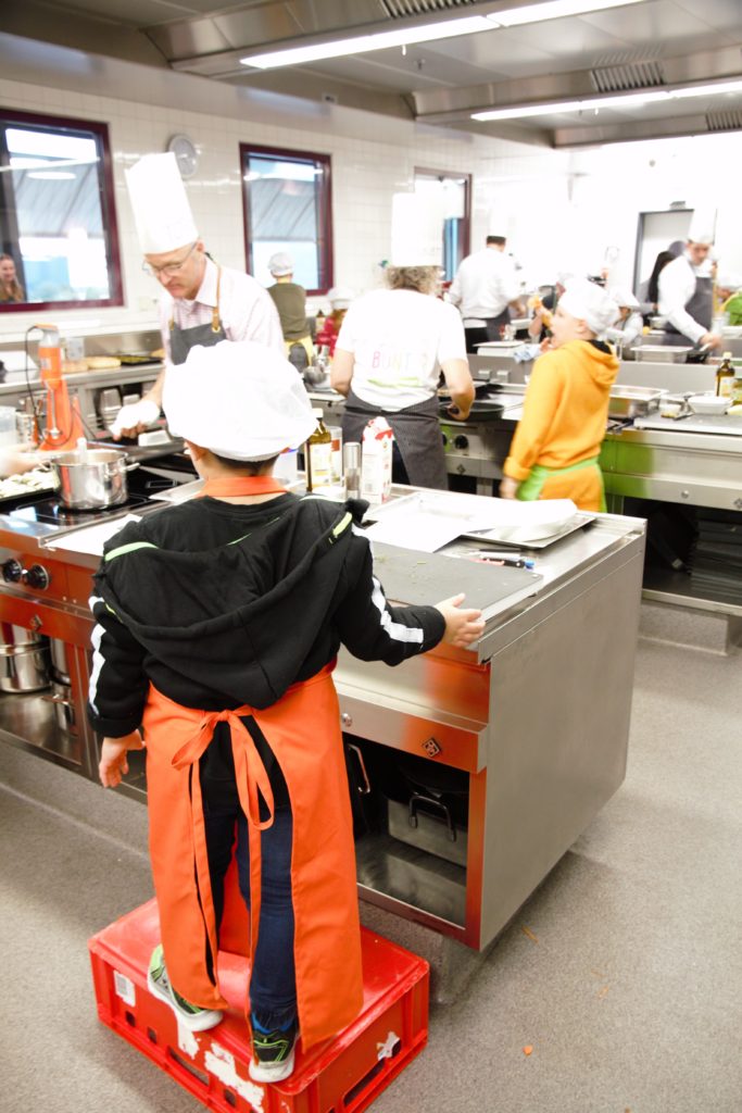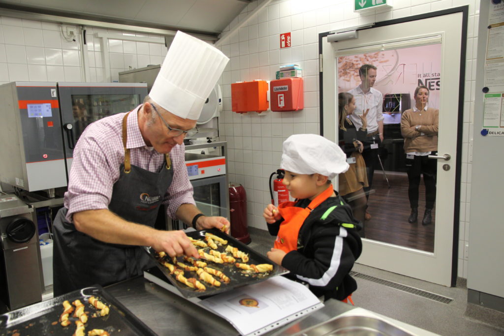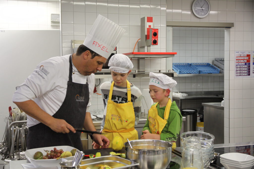 Während die Kinder kochten, erhielten die Eltern im Nebenraum eine Ernährungsschulung. Oft ist Unwissenheit der Grund für eine ungesunde Ernährung zu Hause. Mit solchen Aktionen am International Chefs Day haben Köchinnen und Köche die Möglichkeit, Kinder spielerisch und positiv an eine gesunde Ernährung heranzuführen. „Wenn sie selbst kochen, lernen sie den Umgang mit Lebensmitteln kennen“, erklärt Torsten Dickau. „Außerdem erfahren sie ein persönliches Erfolgserlebnis, wenn sie merken, dass sie sich selbst in der Küche etwas Gesundes und Leckeres zubereiten können.“ Als das Menü fertiggestellt und angerichtet war, haben sich alle an einer großen Tafel zusammengefunden, um zu essen. Das Fazit: Es schmeckte – und gesund war es auch noch.