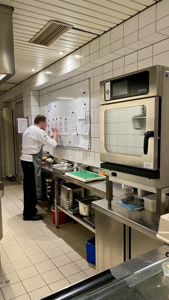 Die „Punkte bis zur Perfektion“ betreffen zu diesem Zeitpunkt zum Beispiel noch fehlende Hilfsmittel wie Matten, Bleche oder Formen, die an den jeweiligen Arbeitsschritt angepasst werden müssen. Weiterhin gilt es, die finalen Anrichteweisen zu entwickeln und die besten Arbeitsabläufe zu finden, sowohl beim Mise-en-Place als auch in der entscheidenden Service-Phase. „Ordnung am Pass“ und „kein Plastik am Herd“ sind da nur zwei der Puzzleteile, die gemeinsam das große Ganze ergeben sollen.