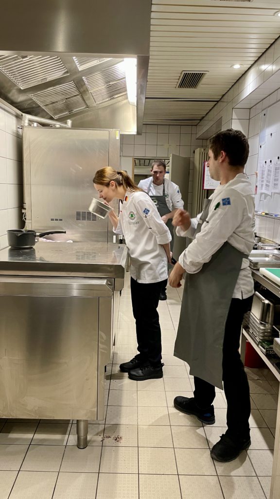 Ziemlich genau 100 Tage vor dem großen Wettbewerb ging es ganz schön heiß her bei der Zusammenkunft in Niedersachsen: „Wir sind auf der Zielgerade der WM-Trainings und jetzt kommt es unter anderem auf das Miteinander und das Füreinander im Team an“, erklärt Mike Wieser. „Für das Trainerteam war es schön zu sehen, wie sehr die Mannschaft zu diesem Zeitpunkt bereits zusammengewachsen ist und wie gut sie miteinander harmoniert.“ Das bestätigt auch Elisabeth Albrecht, die als Patisserie-Trainerin ein besonderes Auge auf Desserts, Schaustück und Petits Fours hat. „Die Arbeit mit den einzelnen Produkten und jedes noch so kleine Detail auf dem Teller sind in der Endphase sehr wichtig, um das spätere Gesamtergebnis bestmöglich zu erreichen.“