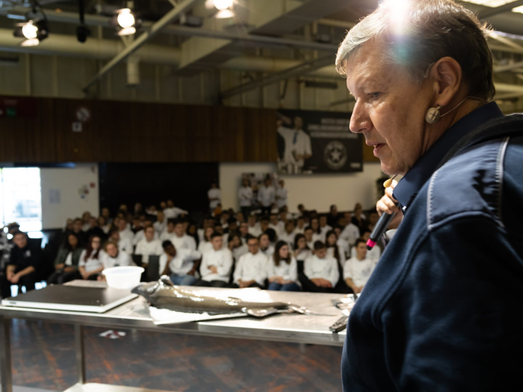 Für die Teilnehmer gab es gleich mehrere Höhepunkte: So war es mucksmäuschenstill, als Walter Grüll live vor Ort einem Stör den Kaviar entnahm. Dem Gründer und Geschäftsführer des gleichnamigen Fischspezialitäten-Geschäfts war es wichtig, den jungen Köchinnen und Köchen Wertschätzung zu vermitteln: „Das Tier muss ein lebenswertes Leben haben. Dann dankt es uns dies mit einem tollen Endprodukt“, sagte er mit Blick auf den Stör und den Kaviar. Wert: 1600 Euro. Dass sie das frisch geerntete Produkt sofort verkosten konnten, war für die Teilnehmer ein einmaliges Erlebnis.