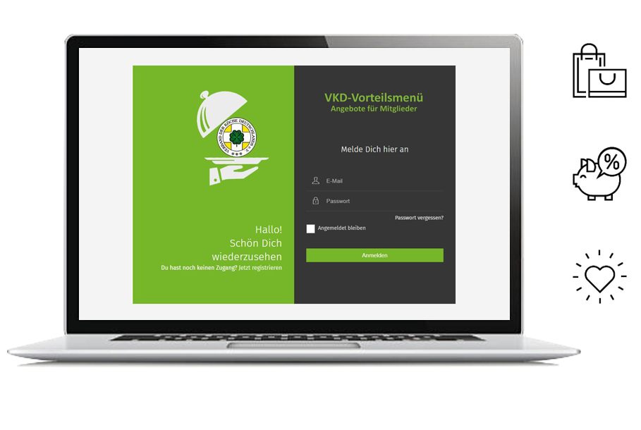 Köchinnen und Köche können sich direkt über unseren Mitgliederbereich einloggen. Mitglieder müssen ihre Mitgliedsnummer bereithalten. Diese brauchen sie nur beim erstmaligen Registrieren. Danach heißt es stöbern! Auf der Seite des VKD-Vorteilsmenüs erhalten Mitglieder in verschiedenen Kategorien einen Überblick über alle Einkaufsmöglichkeiten, bei denen sie sparen können. Sie können zunächst nach einem passenden Angebot suchen, ihren Code generieren und direkt bei ihrer Wunschmarke einkaufen.