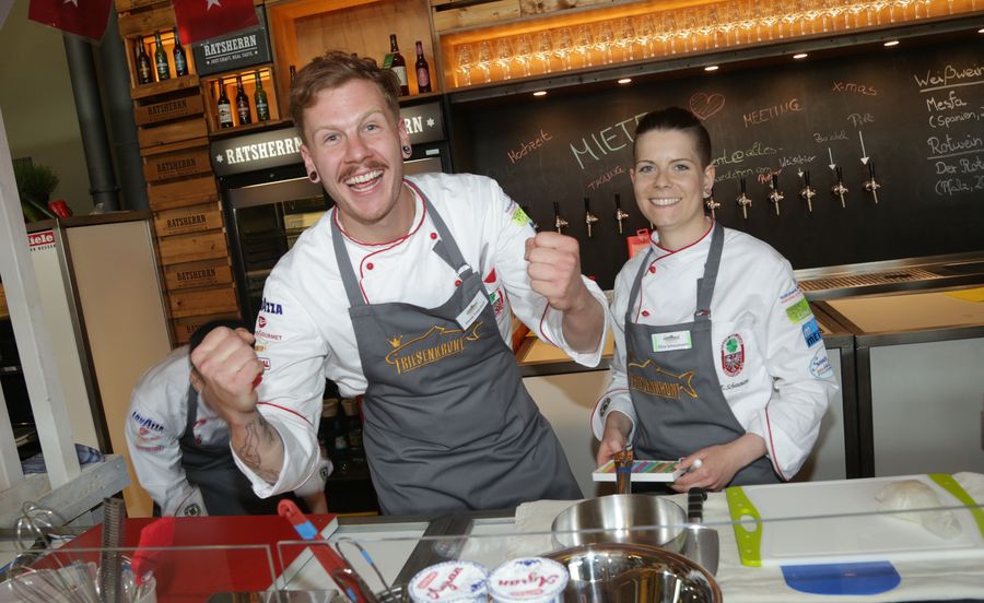 Platz 2: Jury und Publikumspreis: Team Pfälzer Schorle-Schlürfer, Auszubildender Loris Hasenzahl und Ausbilderin Christiane Kastner vom Gesellschaftshaus BASF Ludwigshafen.
